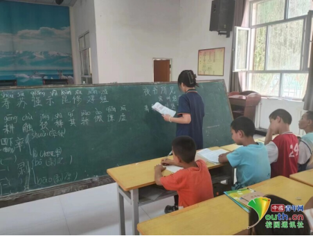 图为小队成员教二年级小学生学古诗。中国青年网通讯员热孜宛古丽·艾力江 摄