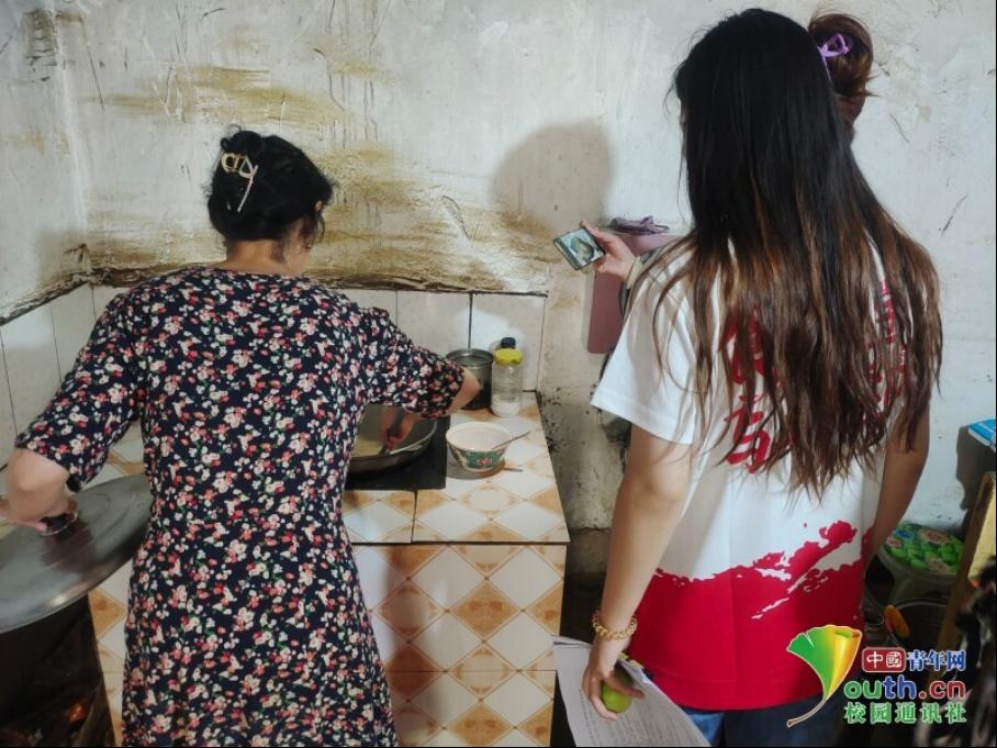 图为实践团成员在村民厨房询问其饮食习惯,更加熟悉当地饮食习惯。中国青年网通讯员彭兆德供图