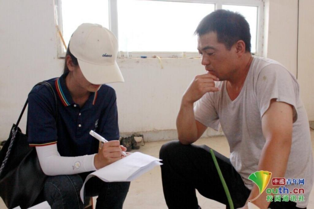 图为实践团成员向当地农户发放并指导填写调查问卷。中国青年网通讯员 肖皓天 供图