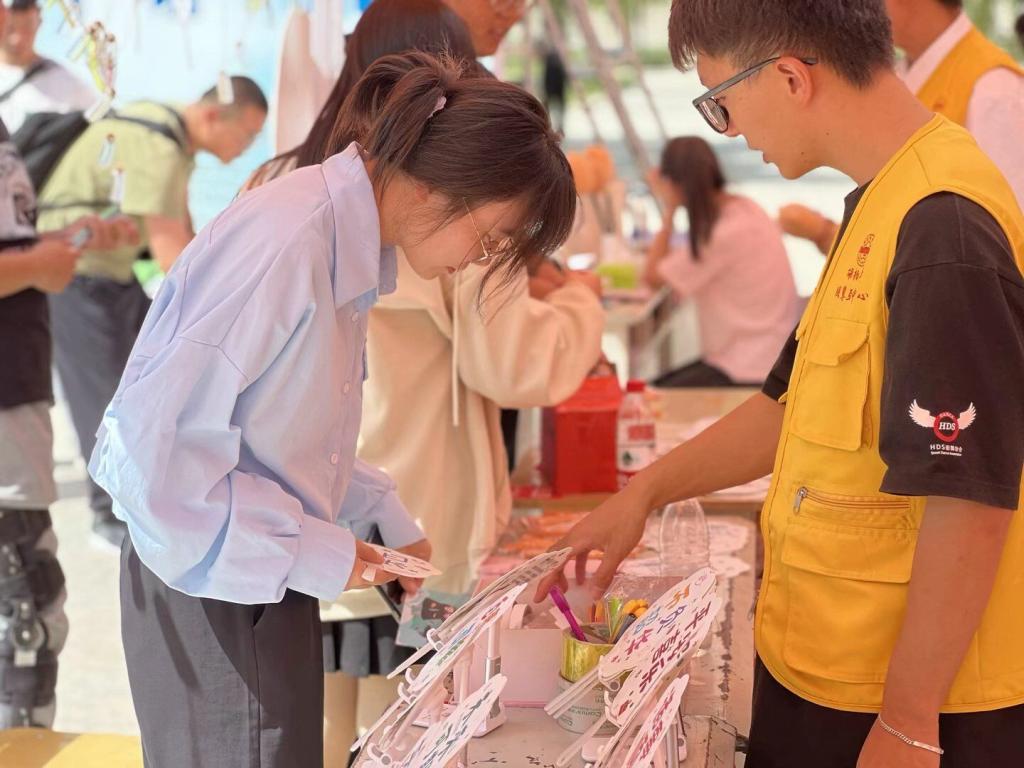 热闹的活动现场吸引了不少正在游览校园的新生,2023级新生李培博在写下自己的心愿放进漂流瓶后感慨道:“很幸运遇见心愿漂流瓶的活动,我收到了其他同学的祝福,也将自己的祝福放进漂流瓶里,希望它也能带给别人温暖。学长学姐都很热情,还耐心的为我解答许多疑问,这让我对大学生活充满了期待。”