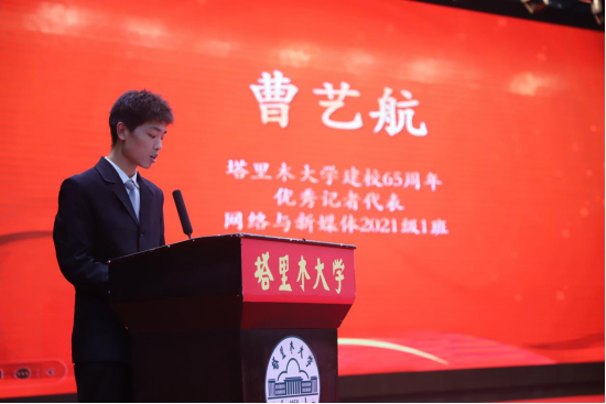 塔里木大学建校65周年系列活动“优秀记者”代表、可亲胡杨·视频记者部部长曹艺航同学发言时说:“参与这次校庆演出活动,我收获了许多宝贵的经验,让我在实践中不断得到成长。今后我将以更严要求、更高水平,做好新闻报道工作。”
