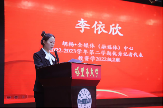 胡杨·全媒体(融媒体)中心2022-2023学年第二学期“优秀记者”代表、红色胡杨·思政教育记者部部长李依欣同学发言表示,作为学生记者,做好新闻报道工作,单凭热爱是远远不够的,要多学习,提升专业能力;勤沟通,强化统筹协调;调心态,克服现实困难。