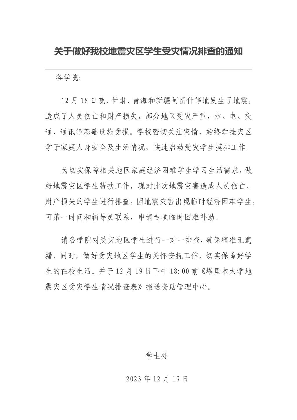 塔里木大学始终牵挂着灾区学子家庭人身安全及生活情况,快速启动受灾学生摸排工作。12月19日,塔里木大学学生处发布通知:“因地震灾害出现临时经济困难学生,可第一时间和辅导员联系,申请专项临时困难补助。”学校密切关注灾情,积极做好受灾地区学生的关怀安抚工作,切实保障好学生的在校生活。