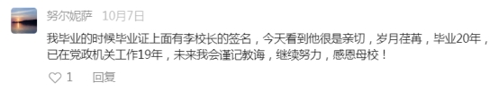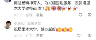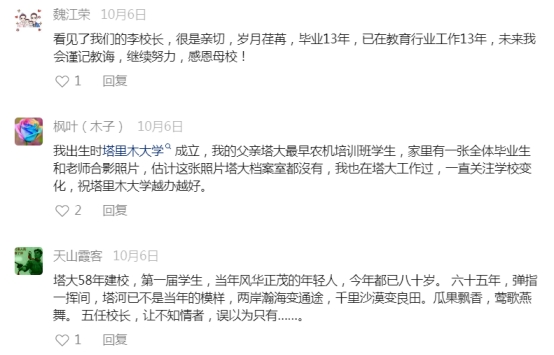 “作为塔大的老校长的后代,看到塔里木大学发展到今天,取得的重大的成绩感到非常高兴和欣慰。塔里木大学是从沙漠边边硬生生建起的高等学府,这是塔里木大学几代教职员工的艰苦努力和无私奉献所取得的成绩,他们这种为党的事业奋斗的精神值得我们学习!”