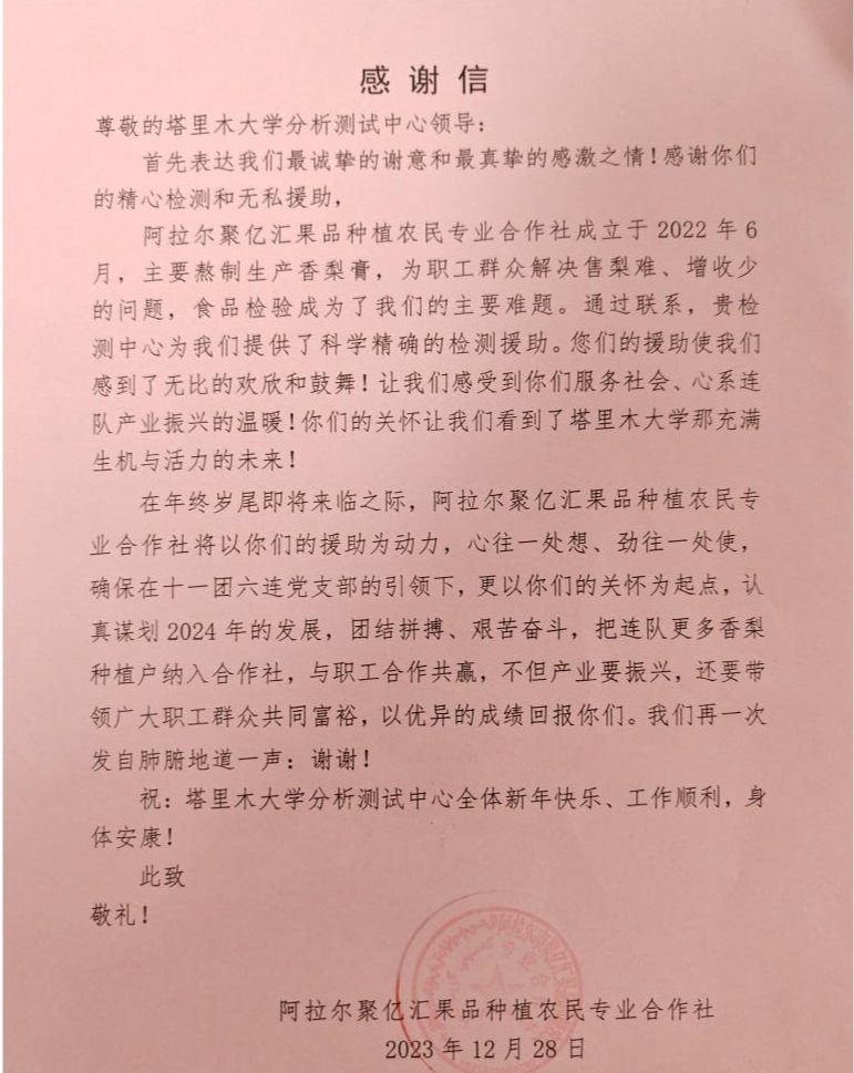 1月2日,我校收到阿拉尔聚亿汇果品种植农民专业合作社送来的感谢信。信中对我校分析测试中心为阿拉尔聚亿汇果品种植农民专业合作社提供的食品检测援助表示感谢。