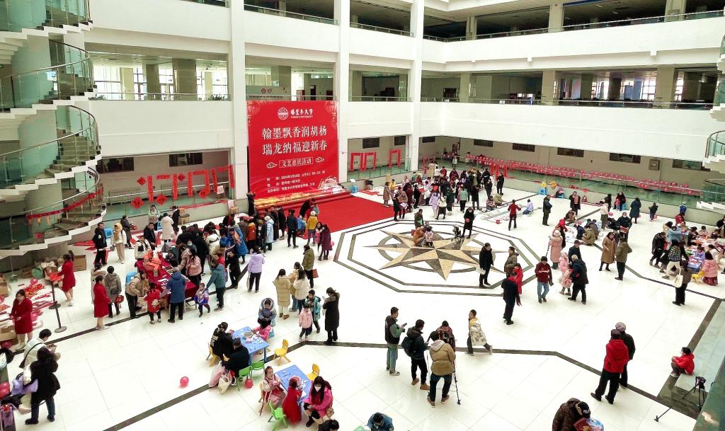 金龙腾飞祥云聚,春满神州万象新。1月18日上午,学校在图书馆一楼举办“翰墨飘香润胡杨 瑞龙纳福迎新春”文艺惠民活动。