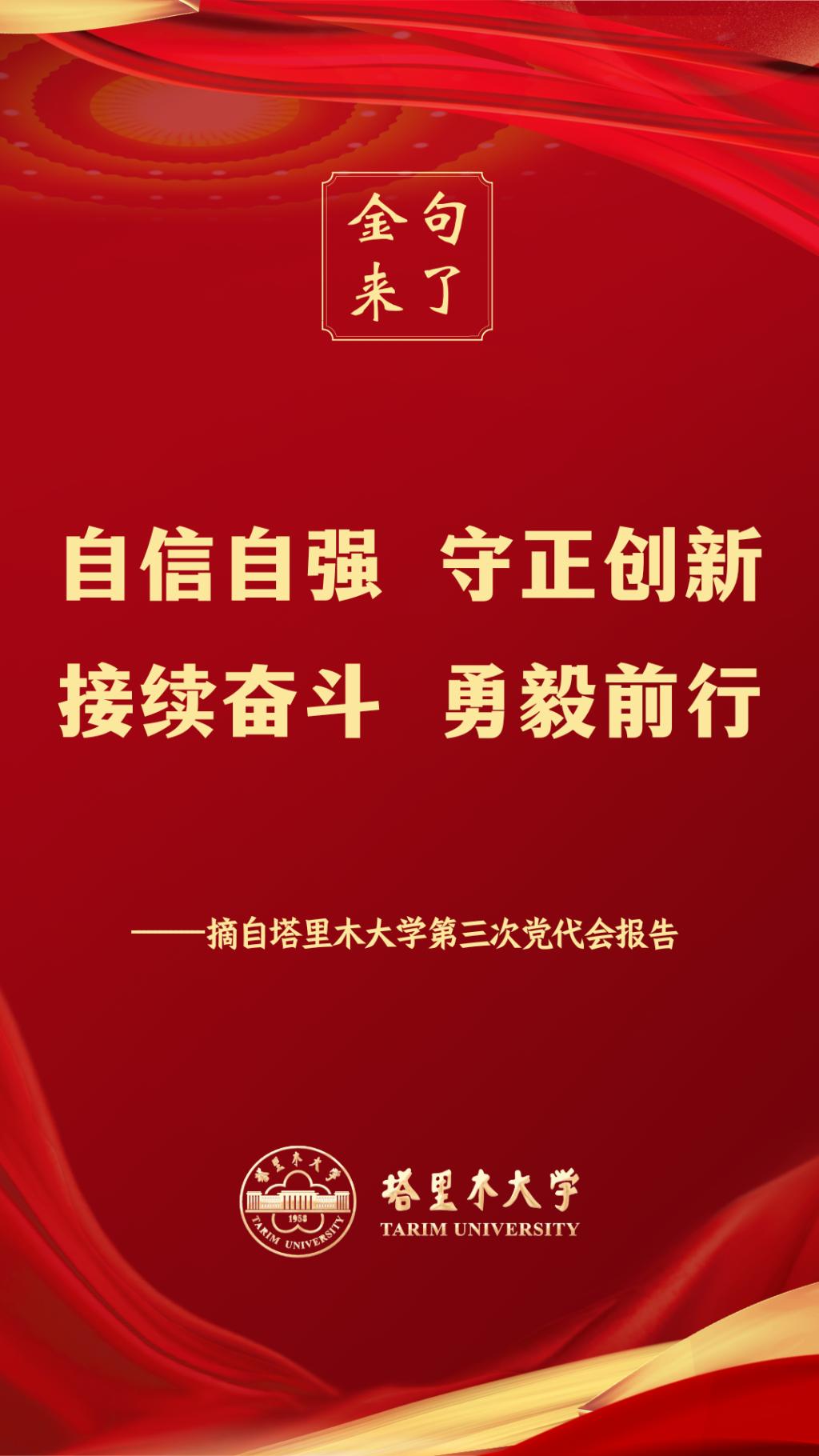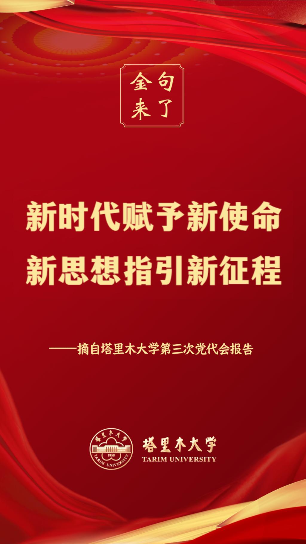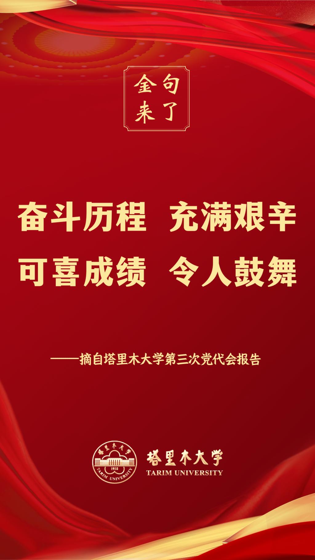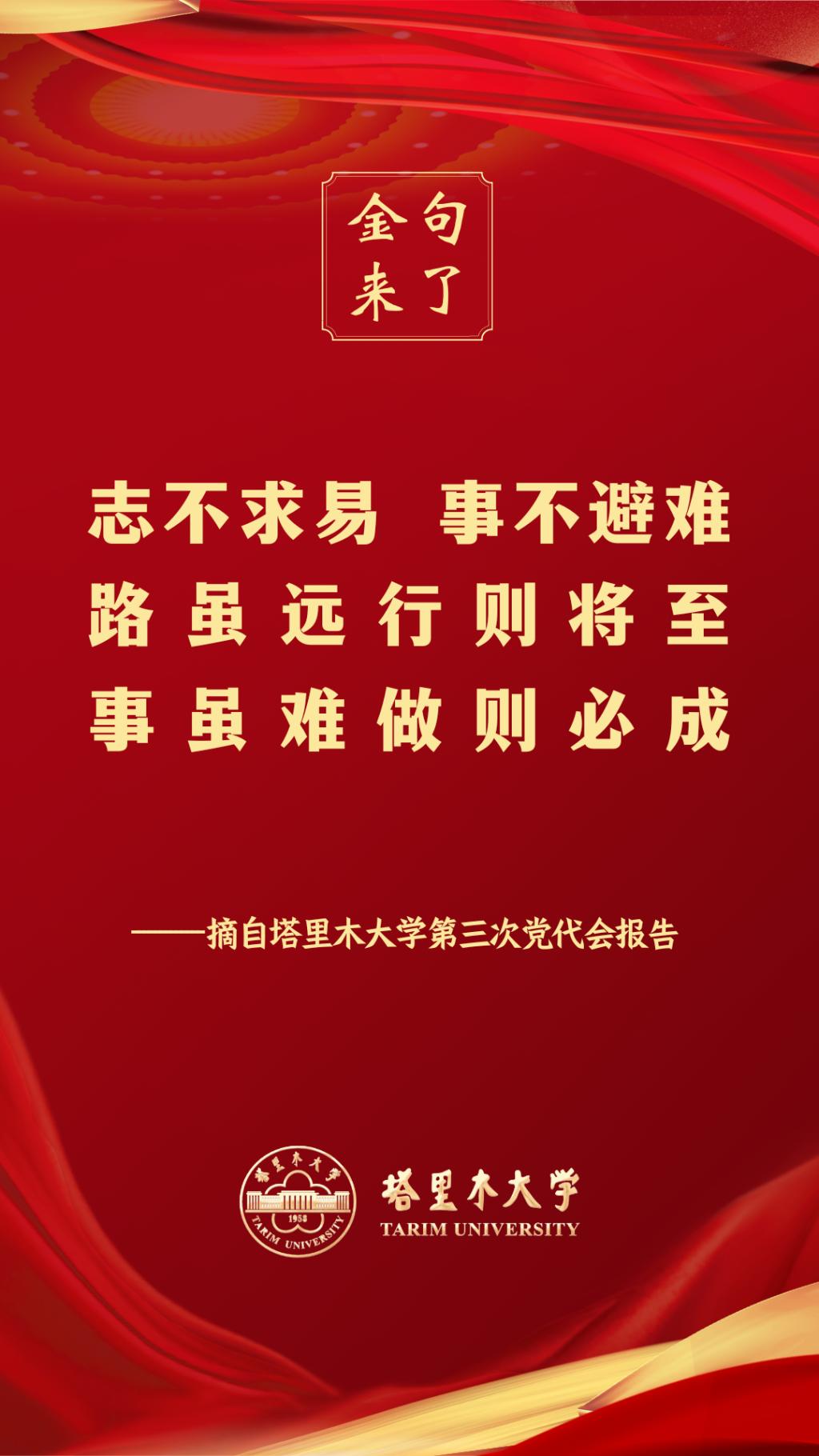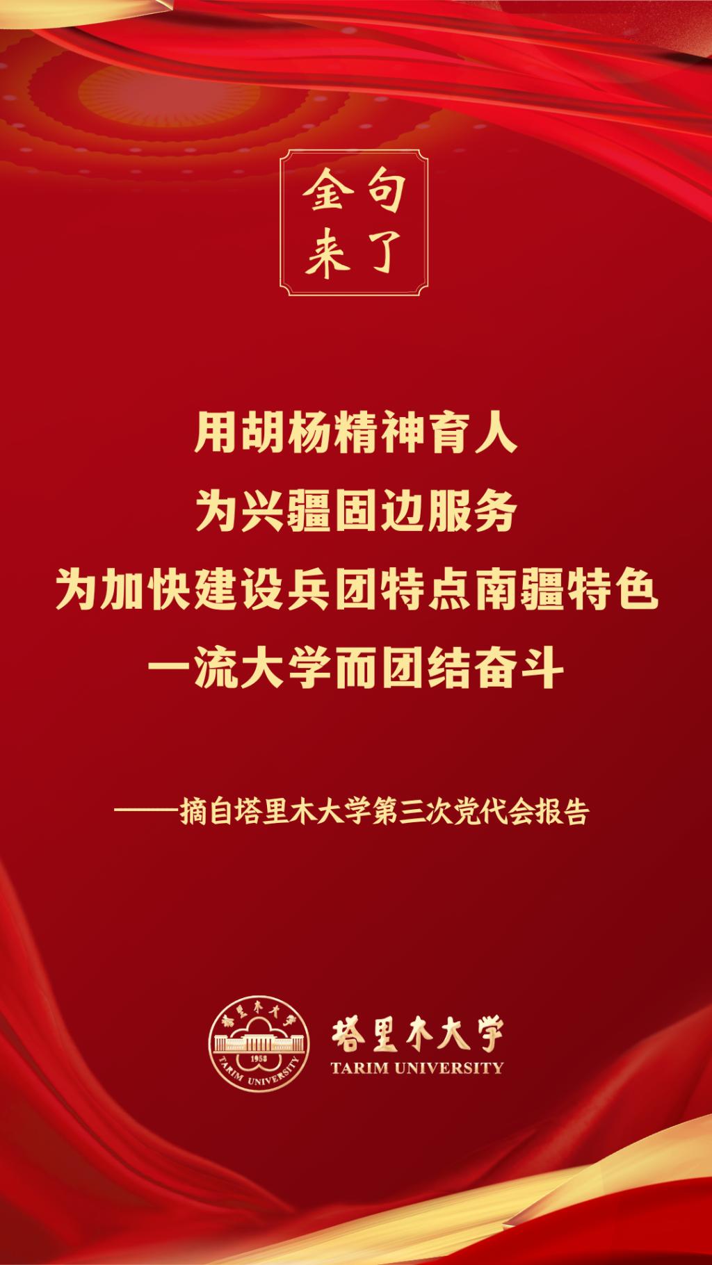 3月10日,中国共产党塔里木大学第三次党员代表大会胜利开幕。党委书记张爱萍代表中国共产党塔里木大学第二届委员会作了题为《用胡杨精神育人 为兴疆固边服务 为加快建设兵团特点南疆特色一流大学而团结奋斗》的报告,现将报告中的金句进行梳理,全校师生快学起来吧!
