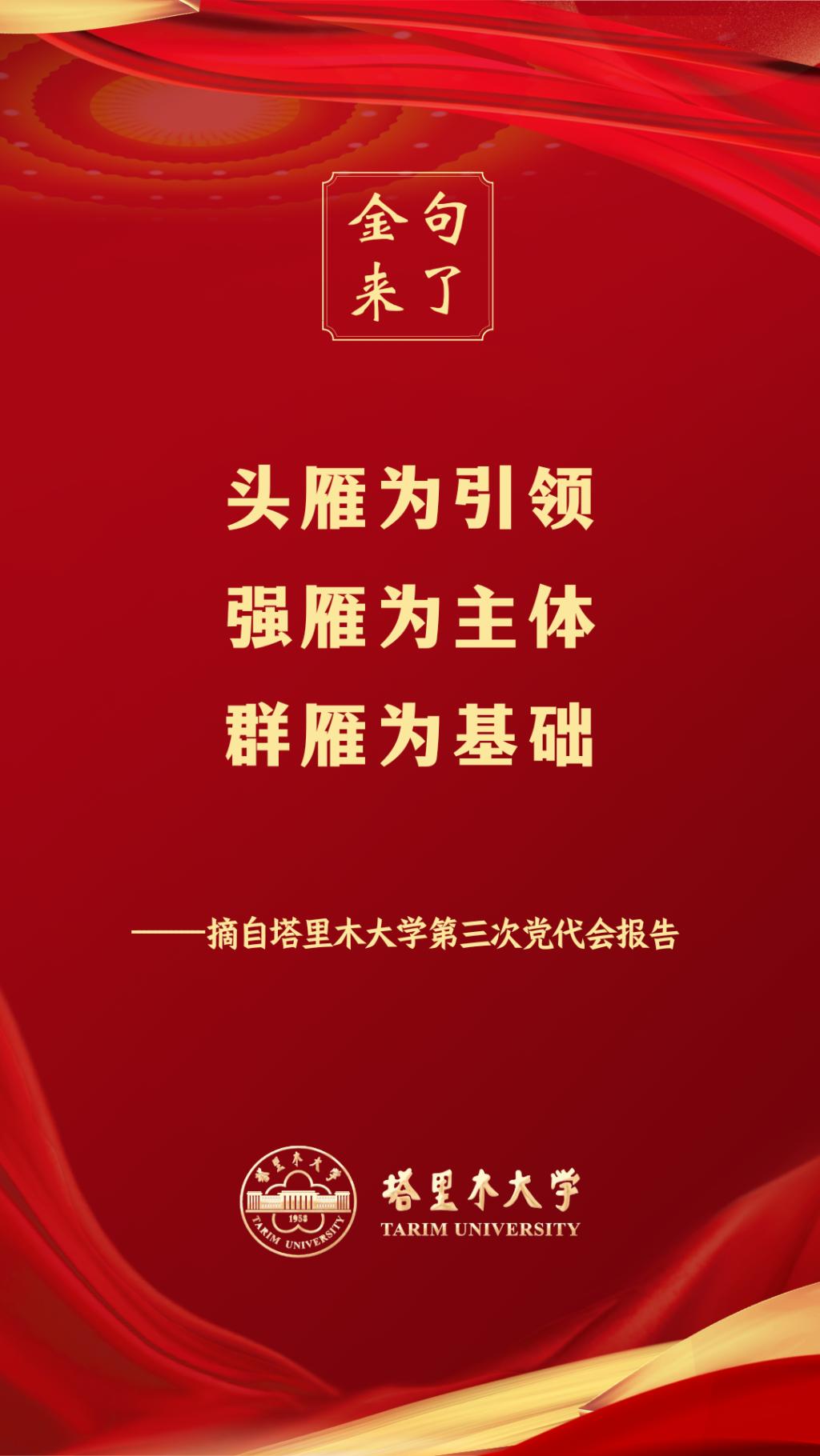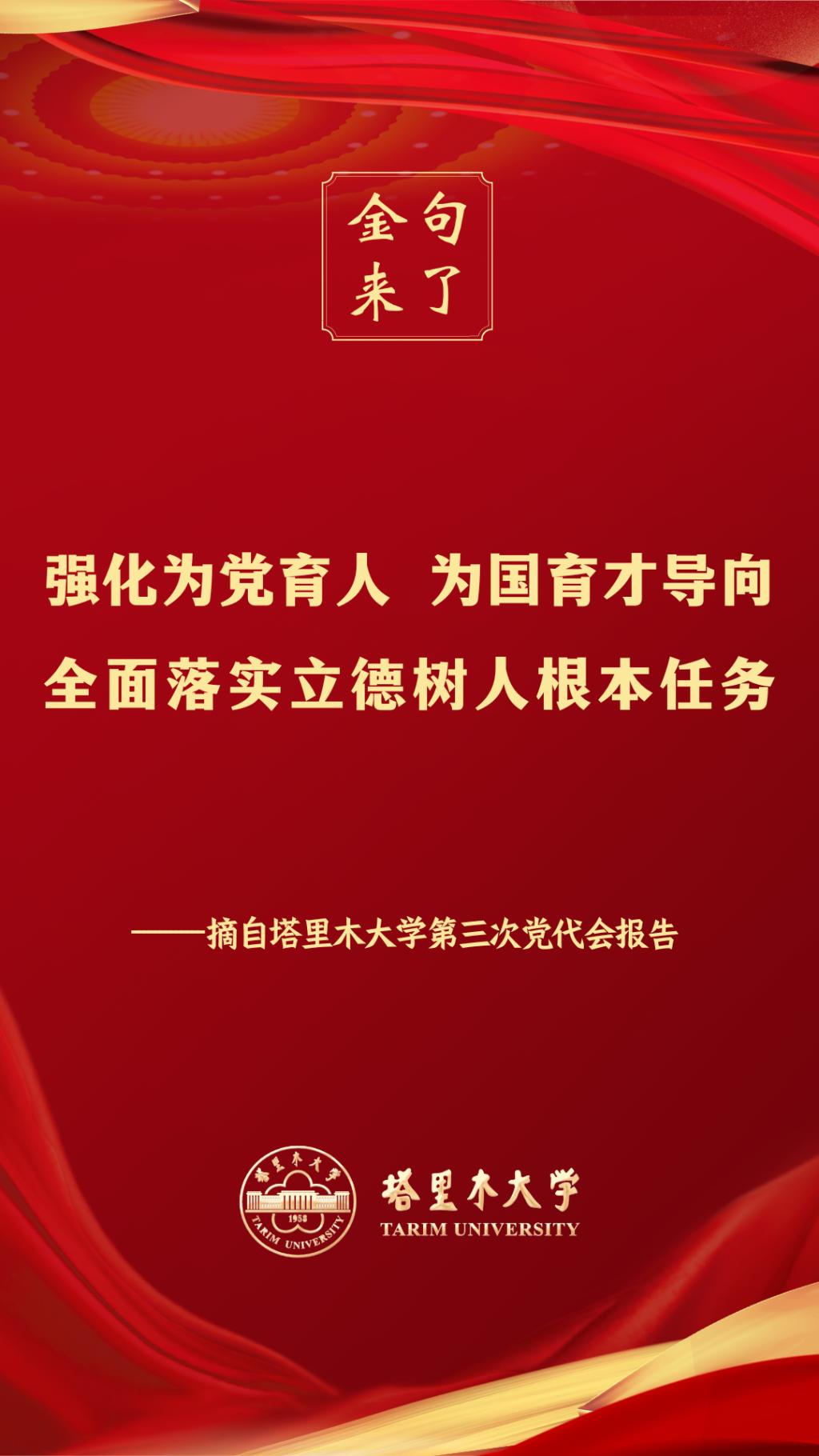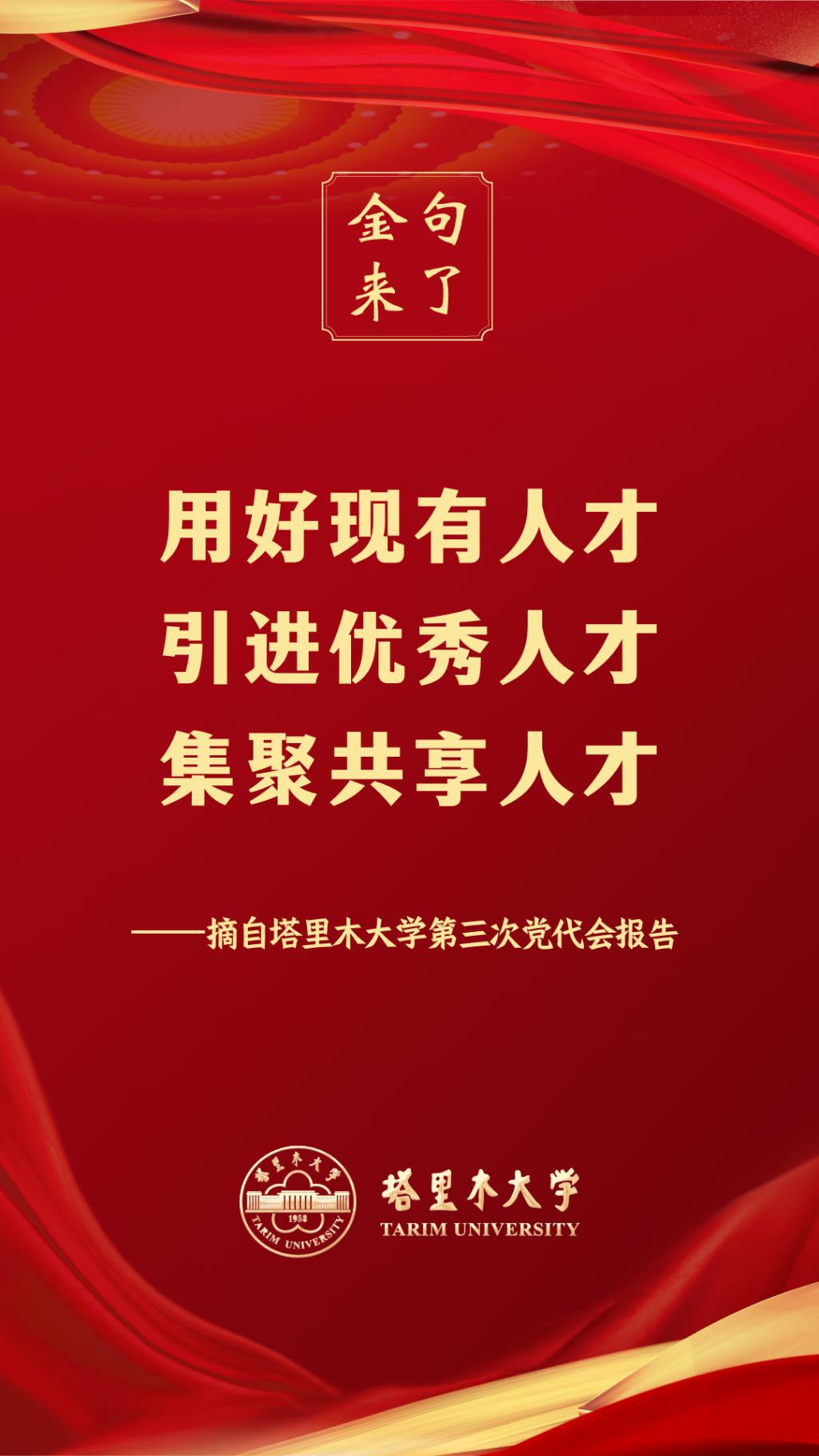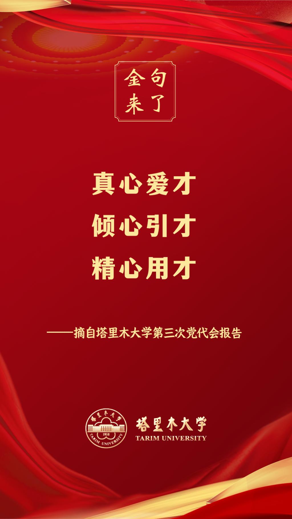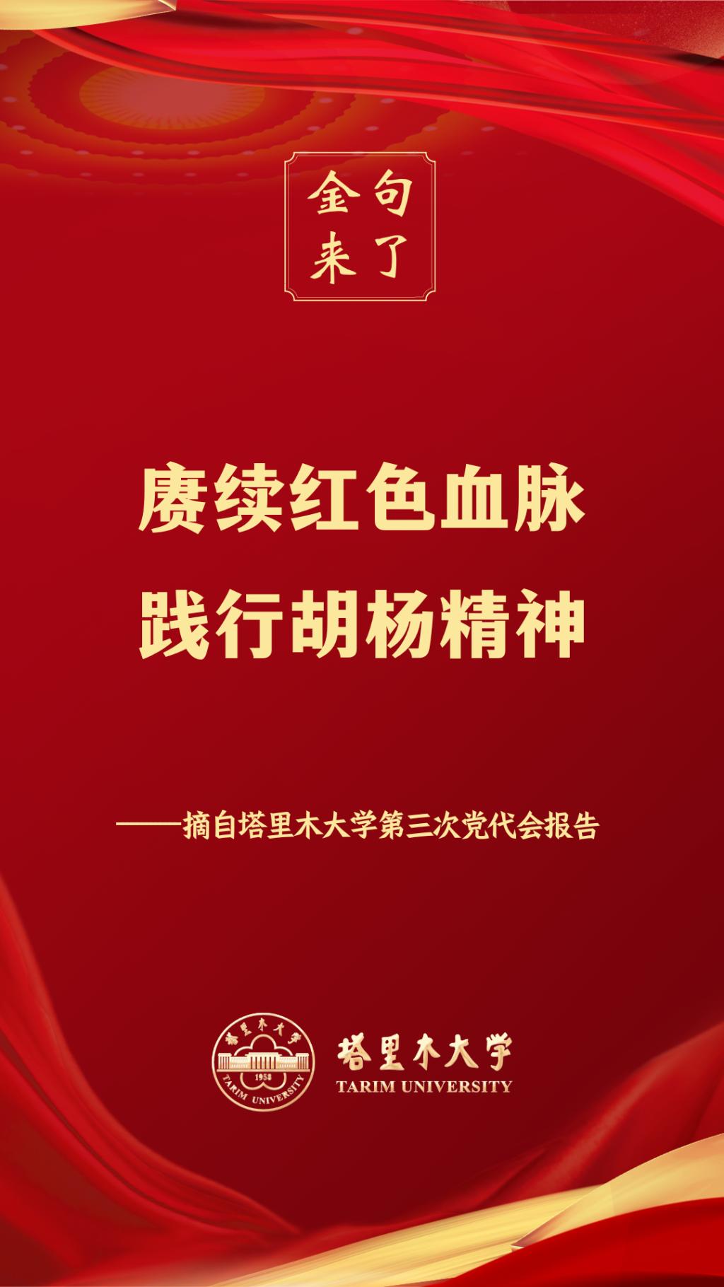 3月10日,中国共产党塔里木大学第三次党员代表大会胜利开幕。党委书记张爱萍代表中国共产党塔里木大学第二届委员会作了题为《用胡杨精神育人 为兴疆固边服务 为加快建设兵团特点南疆特色一流大学而团结奋斗》的报告,现将报告中的金句进行梳理,全校师生快学起来吧!