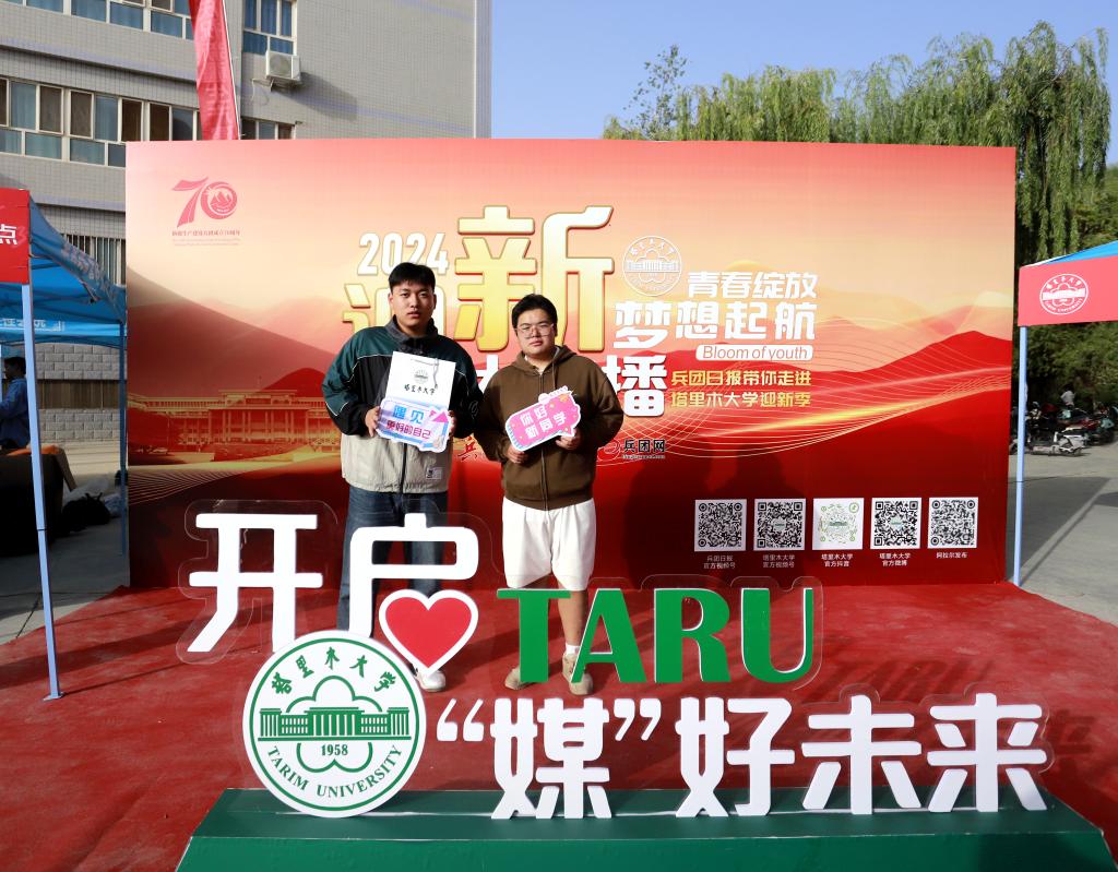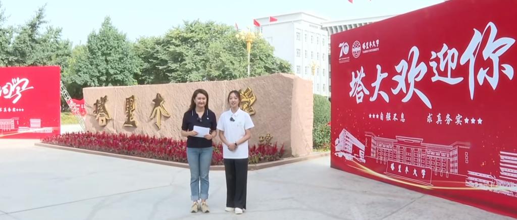 “大家好!欢迎来到‘兵团日报带你走进塔里木大学迎新季’的直播现场,我是兵团日报全媒体记者莫丽德尔·塔帕衣。”“2024级胡杨学子及新生家长们,大家好!我是塔里木大学2023级预防医学专业的学生谭俐,我们现在所在的位置是塔里木大学综合教学楼前……”