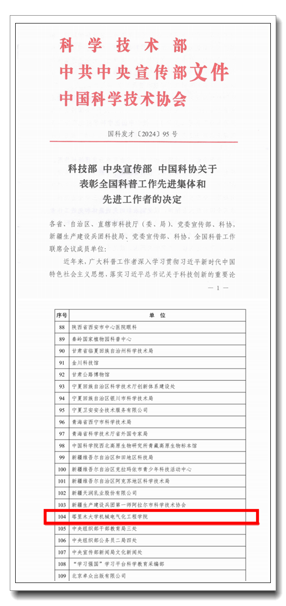 近日,科学技术部、中共中央宣传部、中国科学技术协会联合下发《科技部中央宣传部中国科协关于表彰全国科普工作先进集体和先进工作者的决定》。我校机械电气化工程学院荣获“全国科普工作先进集体”。