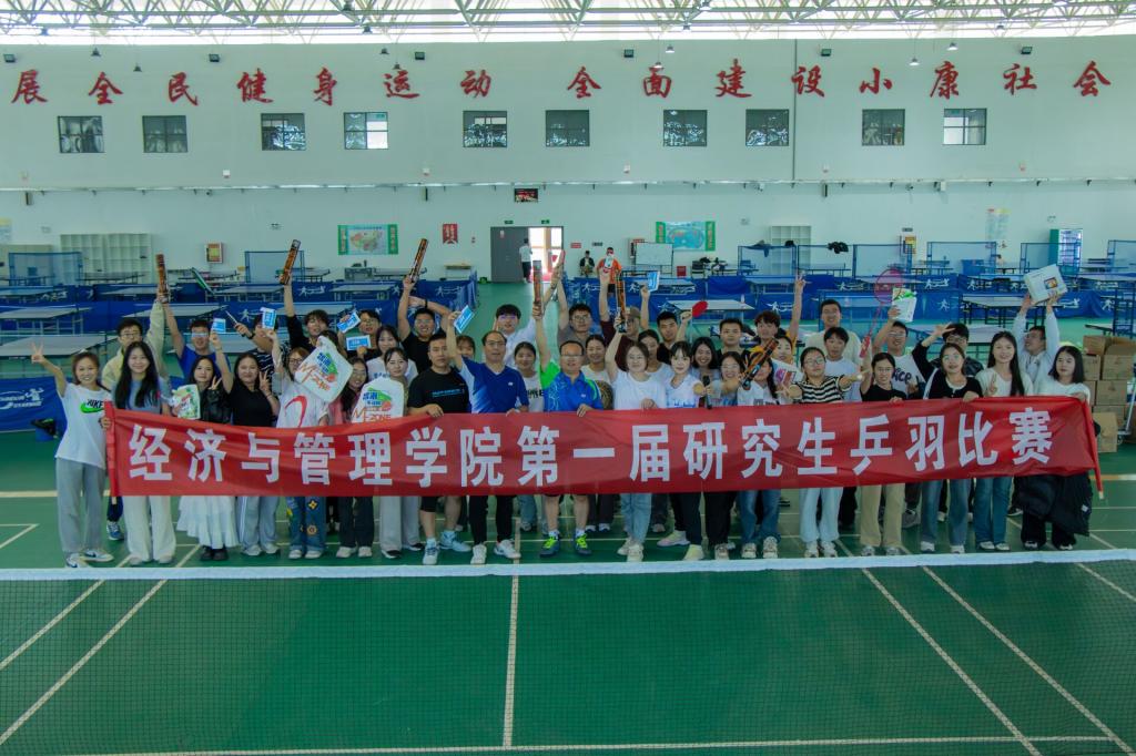 为庆祝中华人民共和国成立75周年,9月30日-10月1日,经济与管理学院第一届研究生乒羽比赛在乒羽馆举办。学院党委书记蒋志辉,党委委员、副院长晁伟鹏参加开幕式,教师代表、全体研究生共同参加。