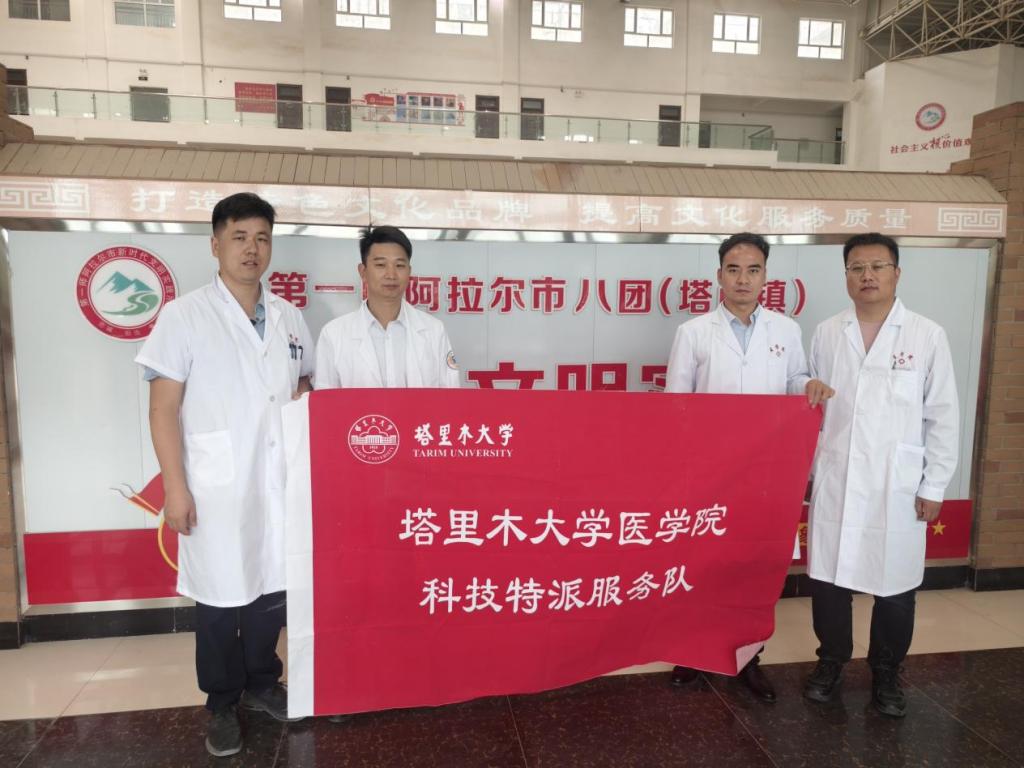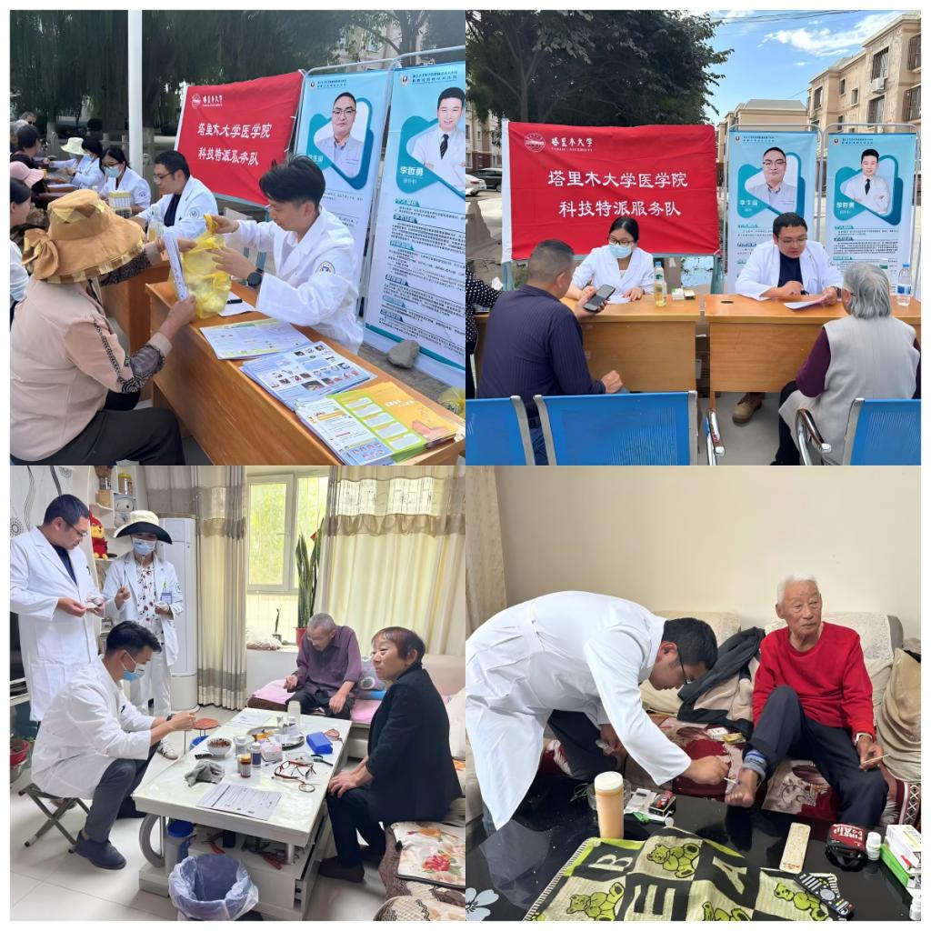 近日,我校医学院科技特派服务队李哲勇、孙立稳、李鹏飞、关闯4位教师与浙大邵逸夫阿拉尔医院医生、护士前往一师八团、五团,为当地居民开展医疗义诊活动。
