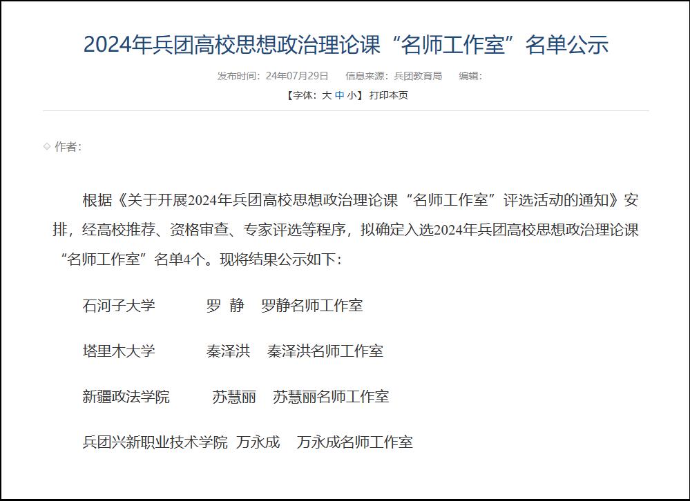 近日,兵团教育局公布了2024年兵团高校思想政治理论课“名师工作室”名单,我校马克思主义学院(法学院)秦泽洪名师工作室成功入选。