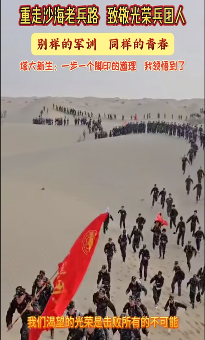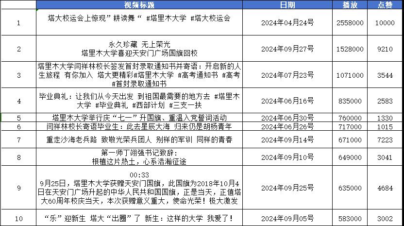 围绕新生军训和迎国旗,精心策划发布系列短视频,受到各级各类媒体大力报道、社会各界广泛关注,引爆全网,火爆出“圈”。2024年9月14日至21日,塔里木大学9000名新生来到“沙漠之门”红色研学、军训拉练,徒步重走“沙海老兵”路。胡杨·融媒体中心策划发布短视频,受到新华社、人民网、光明网、中新网、中国网、中国青年报6家国家级媒体和四川观察、羊城晚报、河南日报、新疆日报、兵团日报等88家省级媒体竞相报道,转发超过53万次,点赞超过125万次,浏览量突破1亿次。2024年9月25日、9月27日、10月1日,塔里木大学获赠天安门广场国旗,并组织开展万名师生迎国旗仪式、百名师生国庆观礼天安门广场升国旗仪式。胡杨·融媒体中心策划发布系列短视频,受到中央广播电视总台、新华每日电讯、新华社快看、人民网、光明网、中国网、中国共青团网、中国大学生在线、中青校媒9家国家级媒体和浙江日报、河南日报、封面新闻、羊城晚报、广东新闻频道、新疆兵团广播电视台、新疆卫视、新疆日报等85家省级媒体竞相报道,转发超过27万次,点赞超过76万次,浏览量突破5000万次。