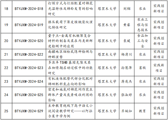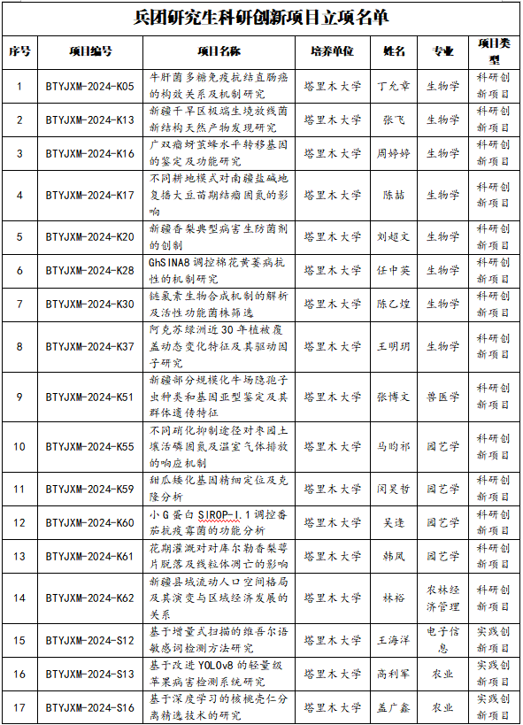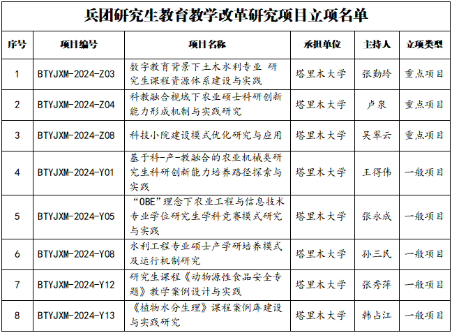 12月25日,兵团教育局公布了2024年兵团研究生教育创新计划项目立项结果。我校33个项目获批立项,其中,研究生教育教学改革研究项目立项8项,研究生科研创新项目立项25项。