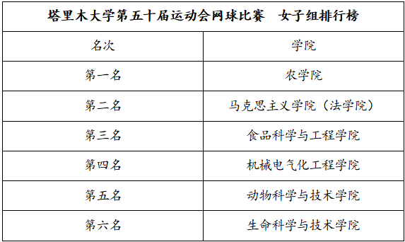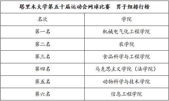 4月13日,塔里木大学第五十届运动会网球比赛在东区田径场圆满结束。经过激烈比拼,机械电气化工程学院男子网球队、农学院女子网球队分别获得男网团体比赛、女网团体比赛冠军。