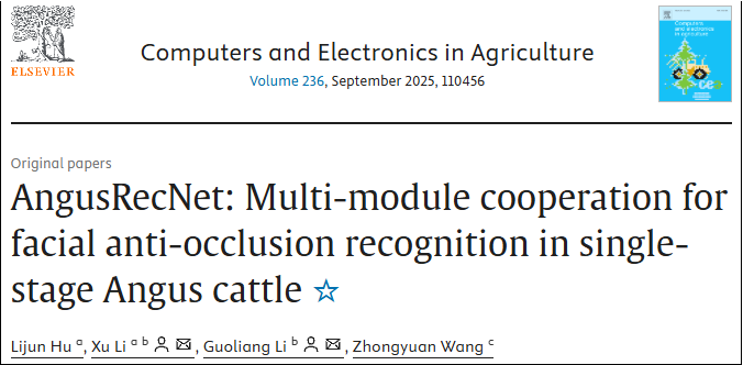 近日,我校信息工程学院硕士研究生胡立俊在国际农林科学领域Top期刊《COMPUTERS AND ELECTRONICS IN AGRICULTURE》(中科院一区,IF=7.7)上发表了题为《AngusRecNet: Multi-module cooperation for facial anti-occlusion recognition in single-stage Angus cattle》的研究成果。胡立俊为第一作者,信息工程学院李旭教授为通讯作者。该研究得到国家自然科学基金和华中农业大学农业农村部智能农业技术重点实验室开放项目支持。