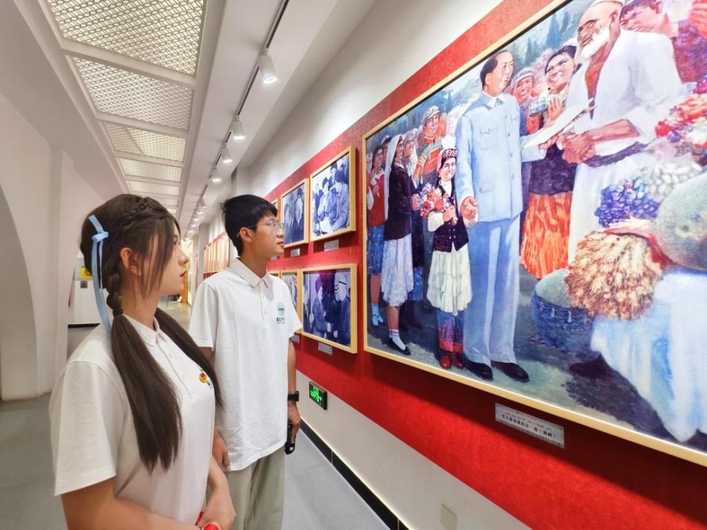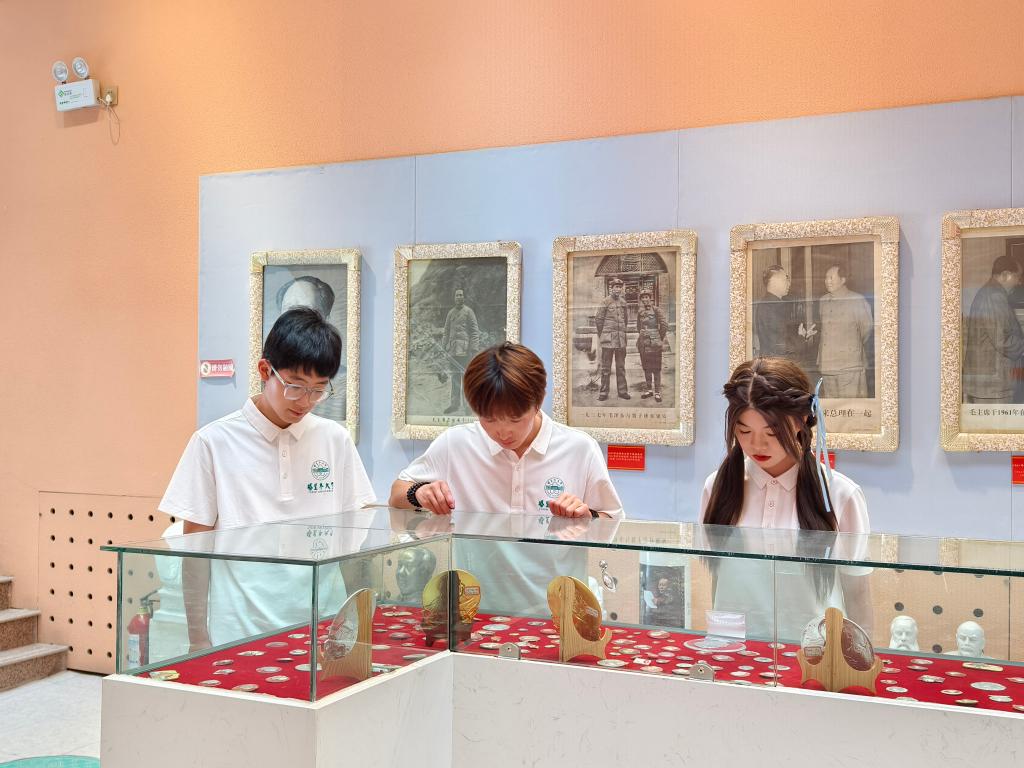 馆内,960枚像章组成的中国地图、5600枚像章黏贴的五角星,分别象征着祖国疆土与56个民族。团队成员在像章前仔细端详,在历史图片中回顾峥嵘岁月。大家久久不愿离去。