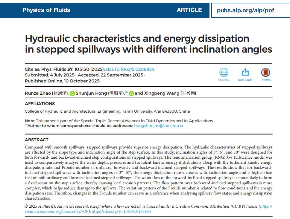 近日,我校水利与建筑工程学院王兴鹏教授的本科生团队取得了系列研究成果,智慧水利2023级4位学生(赵润泽、徐瑞、刘域疆、徐东飞)分别以第一作者在《Physics of Fluids》、《Water Practice & Technology》等国际期刊发表SCI论文4篇(其中中科院二区两篇、四区两篇)。团队教师洪顺军博士为共同通讯作者。