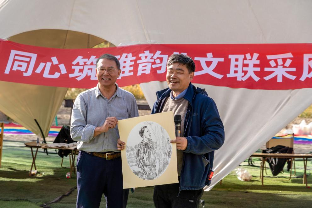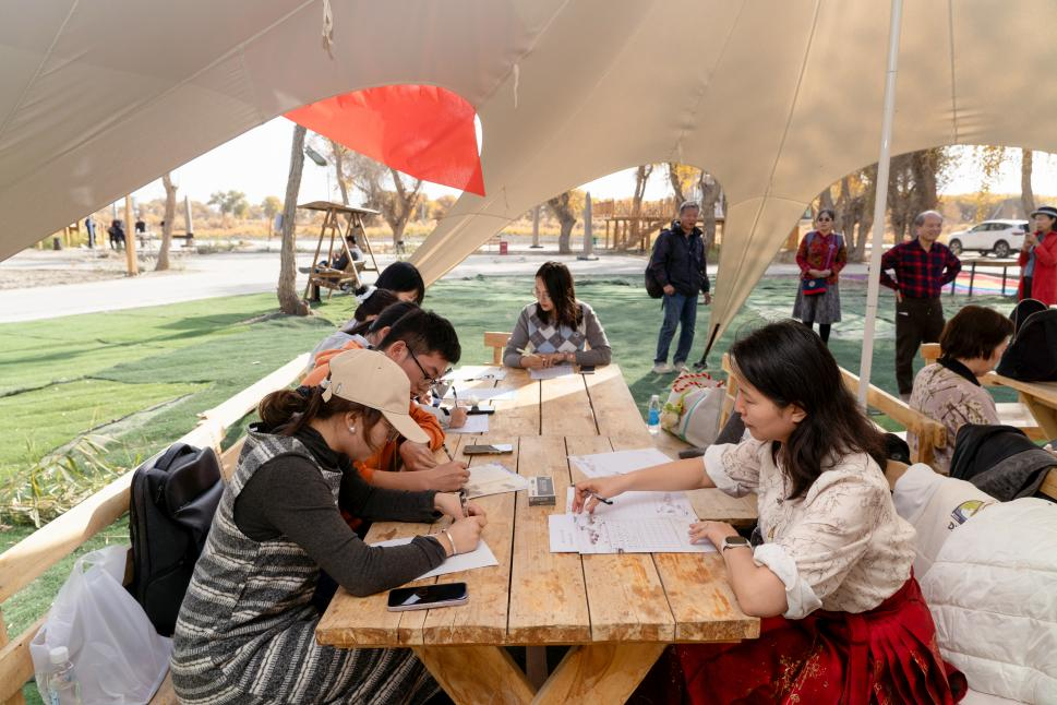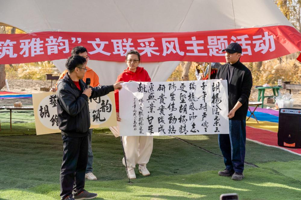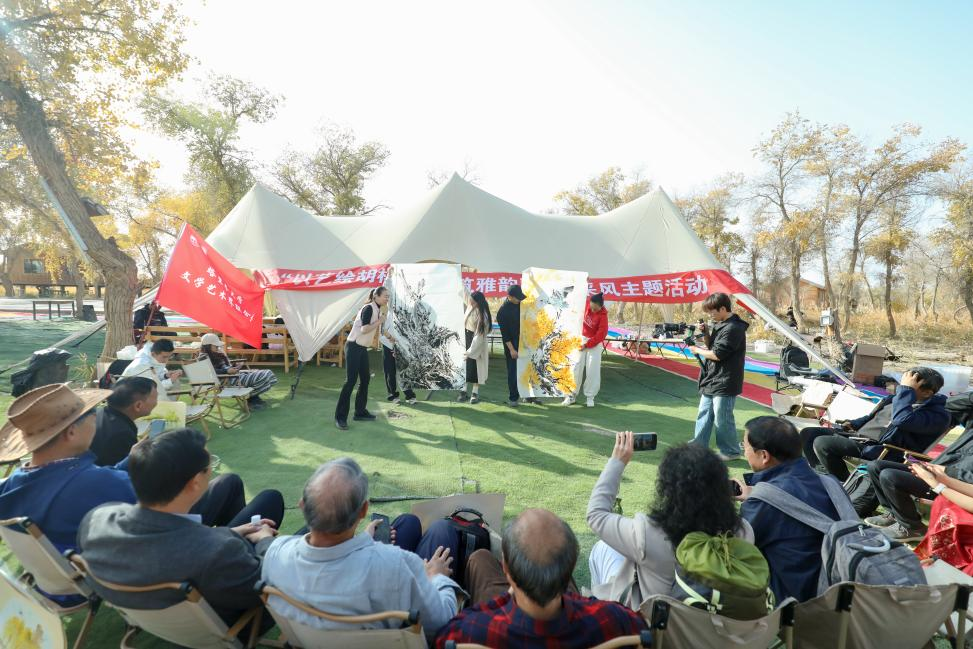 书法家协会、美术家协会挥毫泼墨,苍劲有力的笔锋展现胡杨坚韧挺拔气质。