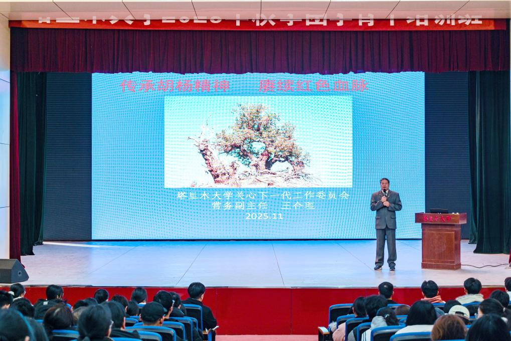 11月9日上午,塔里木大学原党委副书记、校长,塔里木大学关心下一代工作委员会常务副主任王合理,在大学生活动中心为2025年胡杨·融媒体中心骨干能力提升培训班讲授开班第一讲,作了“传承胡杨精神,赓续红色血脉”的专题讲座。