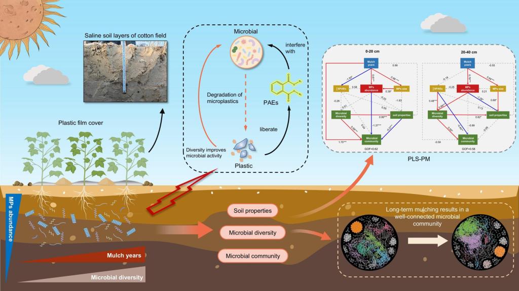该研究通过采集连续1-30年地膜覆盖的棉田土壤样本,定量分析了微塑料(MPs)、邻苯二甲酸酯(PAEs)组成与丰度及微生物群落和功能,考察了盐渍化棉田农业生态系统中残膜微塑料及其降解产物的动态变化。研究显示,长期覆膜虽提升了细菌多样性并增强共存网络复杂性,但MPs与PAEs的积累破坏了细菌共存网络的结构复杂性,同时增强了整体细菌连接,这为盐渍化农田修复及农业生态系统污染防治提供了理论依据。(文/图:张胜楠)