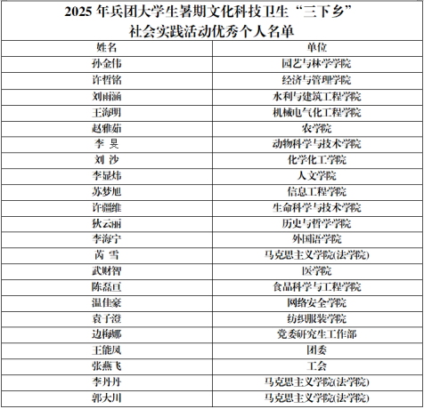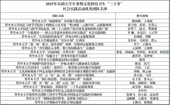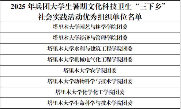 近日,兵团团委、兵团学联联合印发《关于表扬在2025年兵团大学生暑期文化科技卫生“三下乡”社会实践活动中表现突出的集体、个人和项目的通报》,我校获得优秀组织单位8个、优秀团队22支、先进个人22名、特色品牌项目10个。