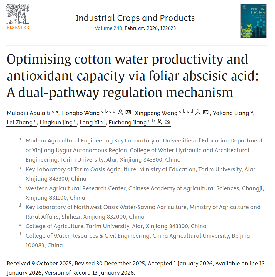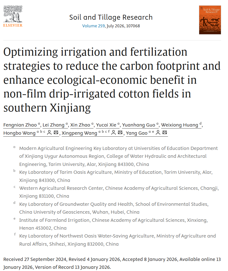 近日,我校水利与建筑工程学院研究生赵丰年、木拉迪力·阿布来提分别以第一作者在国际TOP期刊《Soil & Tillage Research》(中科院一区Top,影响因子6.8)和《Industrial Crops & Products》(中科院一区Top,影响因子6.2)发表题为“Optimizing irrigation and fertilization strategies to reduce the carbon footprint and enhance ecological-economic benefit in non-film drip-irrigated cotton fields in southern Xinjiang”和“Optimising cotton water productivity and antioxidant capacity via foliar abscisic acid:A dual-pathway regulation mechanism”的研究论文。水利与建筑工程学院王兴鹏教授为通讯作者,水利与建筑工程学院教师王洪博为共同通讯作者。研究分别得到国家重点研发计划、塔里木大学校长基金,自治区教育厅普通高等学校现代农业工程重点实验室项目支持。