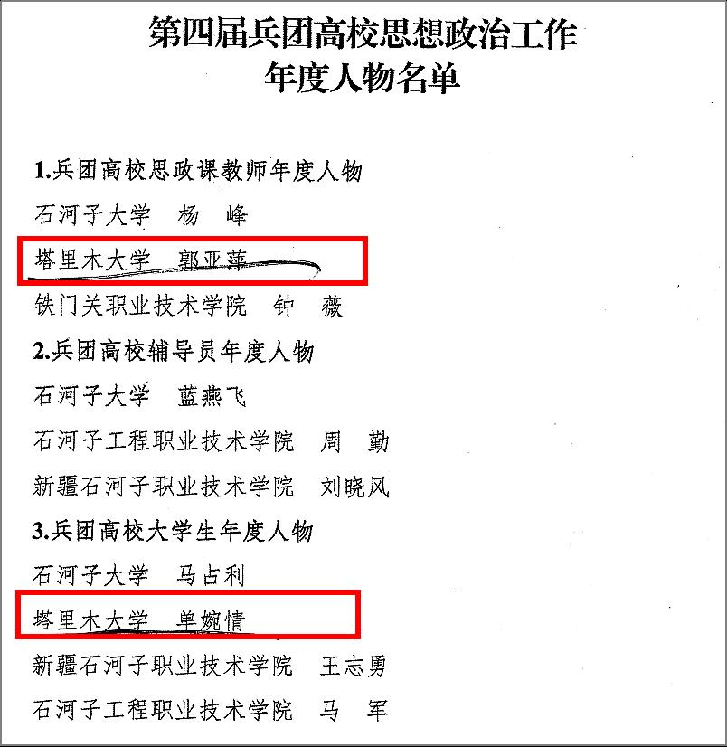 近日,第四届兵团高校思想政治工作年度人物推选展示活动评选结果公布,我校教师郭亚萍获评“兵团高校思政课教师年度人物”,学生单婉情获评“兵团高校大学生年度人物”。