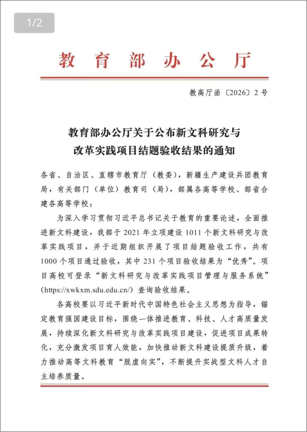 此次项目通过验收并获评“优秀”,体现了教育部对我校新文科建设工作的认可,也反映了我校在项目培育、过程管理和质量保障方面的投入力度。学校将以此为契机,进一步总结凝练项目成果,加强成果推广与应用,持续深化新文科建设内涵,推动文科教育高质量发展,为培养具有家国情怀、全球视野、创新精神和实践能力的高素质复合型人才贡献更大力量。