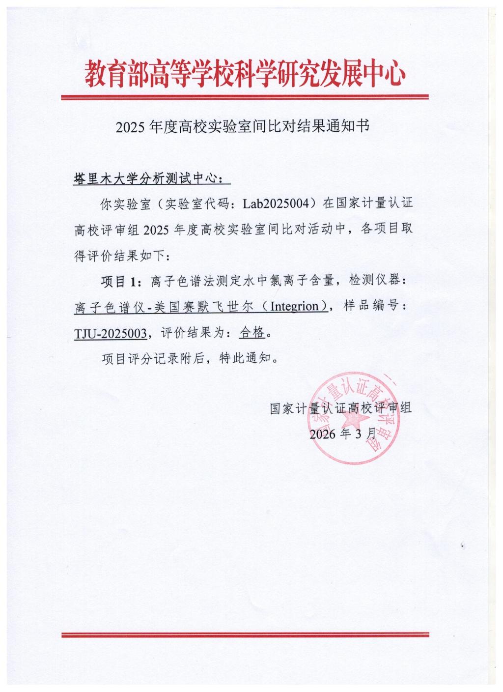 近日,教育部高等学校科学研究发展中心正式公布《2025年度高校实验室间比对结果通知书》,我校分析测试中心参与的比对项目一次性通过。