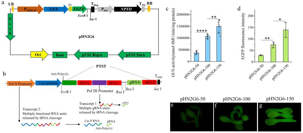 本研究搭建高效稳定的启动子筛选平台,设计含GUS与EGFP双报告基因的pHN2G载体,优化混合取样方法以提升数据稳定性;借助该系统定量比对多种启动子活性,探明新型嵌合启动子P35SIC47驱动活性为传统P35SI的27倍,为高效表达元件筛选提供便捷工具。同时构建Cas9蛋白翻译效率评估系统,搭建pHN2AGUS与pHN2AGFP融合报告载体,实现蛋白翻译水平精准量化,证实人类密码子优化的hCas9在植物细胞中翻译效率更优。此外,研究提出多基因编辑系统结构优化新策略,通过pHN2G6载体明确poly (A) 长度优化可显著提升基因表达活性,为STU系统结构优化提供直接依据。