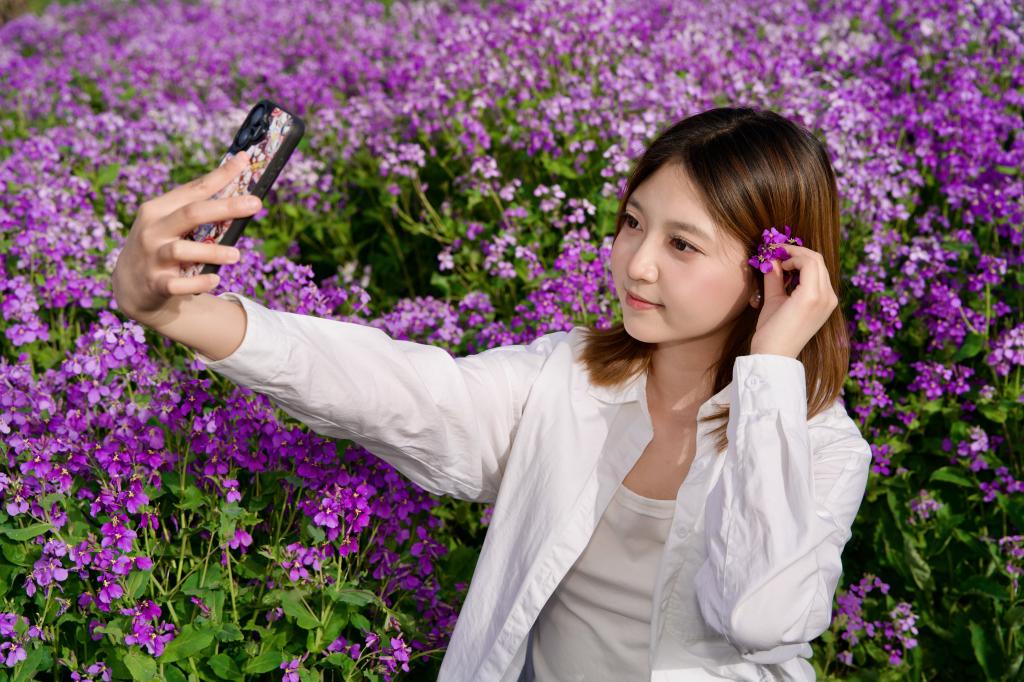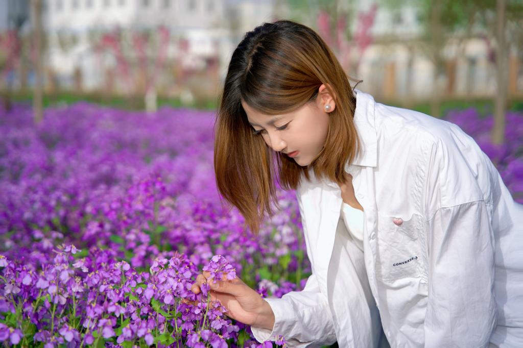 二月兰:俯身靠近花丛,让浅紫花瓣轻覆指尖,微微侧身望向花径深处,眼神柔和放空,摄影师灵活拍摄,凸显二月兰的成片氛围感,清晰呈现花瓣的淡雅质感,自带清新治愈滤镜,无需刻意摆拍也能出片。