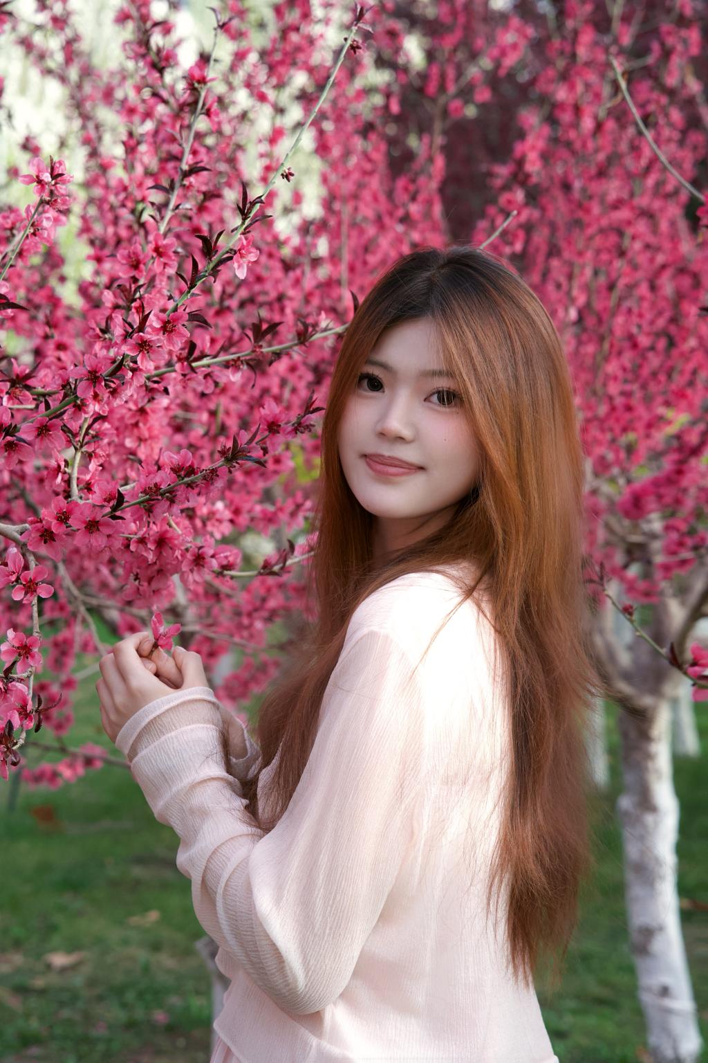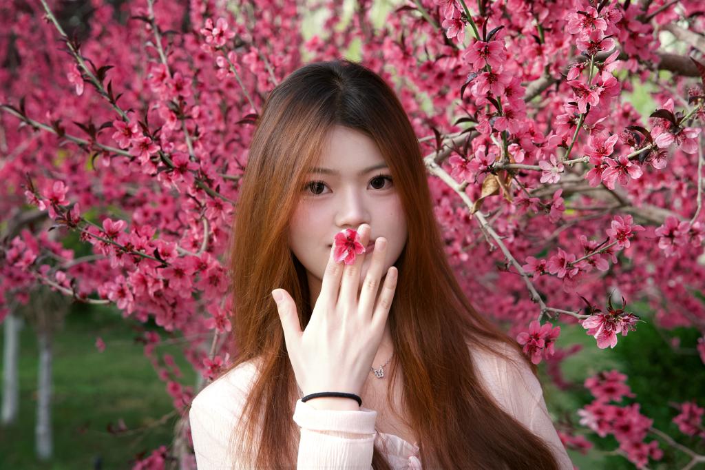 桃花:站在桃枝斜前方,一手轻托花枝,让粉嫩花瓣轻贴脸颊,微微歪头浅笑,眼神灵动柔和,摄影师灵活拍摄,清晰捕捉花瓣的细腻纹理与人物的青春神态,凸显桃花的娇俏与少女感。
