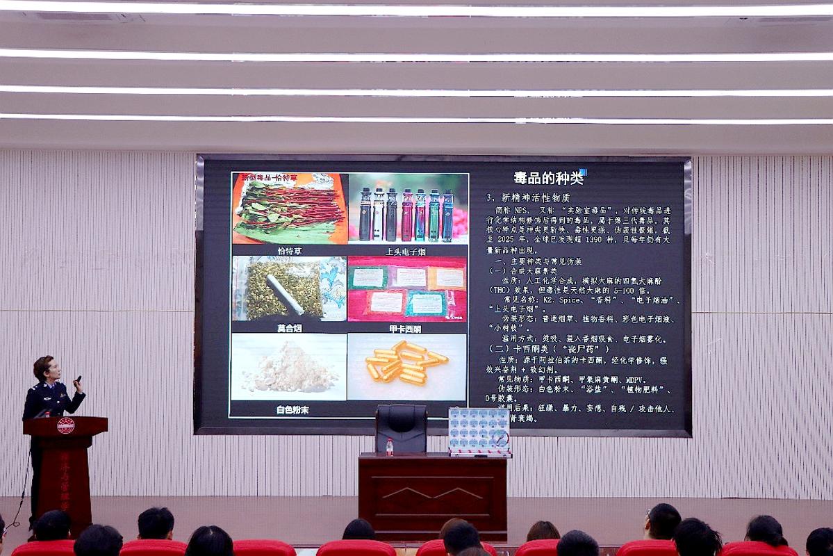 民警结合近年来涉及青少年的真实涉毒案例,深入浅出地讲解了《中华人民共和国禁毒法》等相关法律法规,详细讲述了毒品的种类及其危害,切实增强在校大学生识毒、防毒、拒毒的意识和能力,营造浓厚的校园禁毒氛围。活动现场,民警还展示了仿真毒品模型,结合实物讲解了传统毒品与新型精神活性物质的区别及危害,