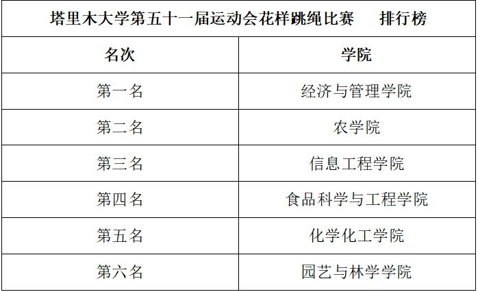 4月12日,塔里木大学第五十一届运动会花样跳绳比赛在风雨操场圆满结束。最终,经济与管理学院获得花样跳绳比赛团体冠军。