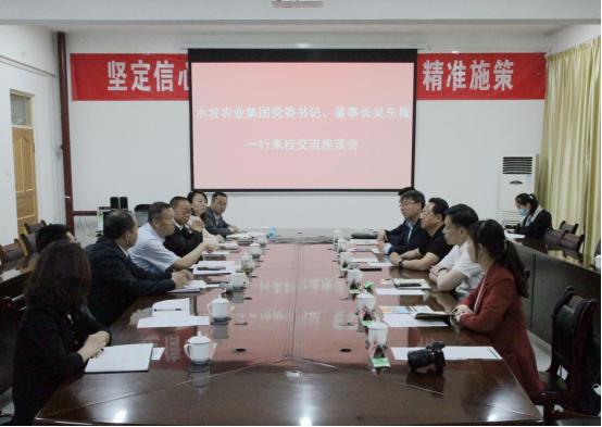 5月20日上午,水发农业集团党委书记、董事长吴东振一行来校访问并召开座谈会。水发农业集团有限公司党委委员、副总经理刘道营陪同,我校党委常委、副校长于军出席。有关部门、学院主要负责同志参加会议。会议由科技处处长魏芹主持,在行政楼317会议室召开。