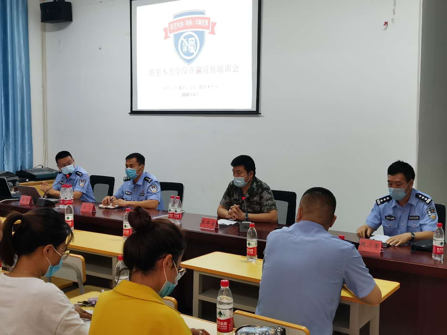 2020年5月28日下午,保卫部在民兵之家举行反诈骗宣传培训会。阿拉尔市城区公安局民警李强主讲,阿拉尔市城区公安局副局长王飞、城区公安局治安大队教导员魏小军、城区公安局反诈宣传分队队长李强、各学院辅导员、大学路派出所民辅警参加。培训由保卫部部长朱夺宝主持。