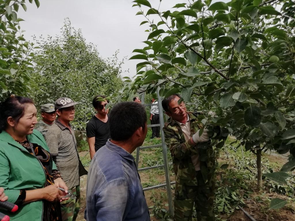 张教授查看了试验田长势,待职工都聚集完毕,他开始向职工们现场教学。“科学进行田间管理,将会对当年和次年的座果率起到非常大的作用!”教授一边讲解,一边为身边的职工群众做示范,从透光率、通风率,到消除顶端优势,让营养富集果实,他尽量将专业术语转化成老百姓通俗易懂的实用技术,还时不时回答着职工提出的顾虑问题。围绕提质增效、养树护林等不仅让职工群众了解如何使果树多结果子,更用发展的眼光教会大家要可持续种植,会养会管,这样才能持续增收致富。