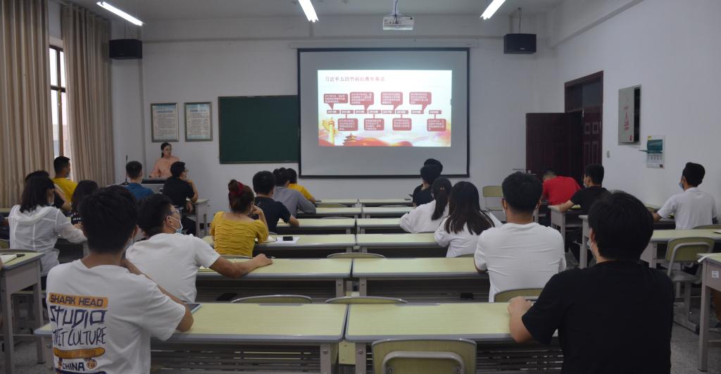 李丹丹带领学生团干部重温习近平总书记对青年的寄语,梳理总结了8年来习近平总书记每逢五四青年节时对青年给予的希望,围绕“青年是什么、青年的责任与担当、我们身边的青年故事”三个篇章展开分享。