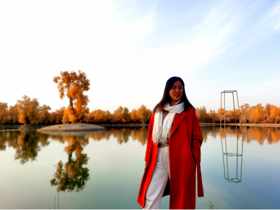 郑昕副教授酷爱旅游,喜欢探索新奇的世界,体验不同寻常的生活。“我以前从来没有来过新疆,心目中是一片广袤、美丽而神秘的新天地。第一次进疆,从哈尔滨飞到乌鲁木齐,再飞跃天山,看到连绵不绝的雪山、高崇的博格达峰,心生赞叹和敬畏;从哈尔滨机场看朝霞泛起,到阿克苏机场看日落天边,更加感叹我国领土之广阔。”郑昕副教授说。来时正值金秋十月,金黄色的树叶,在阳光的照耀下,更是层林尽染、美轮美奂,将单调的沙漠,装点的像童话故事般美丽。