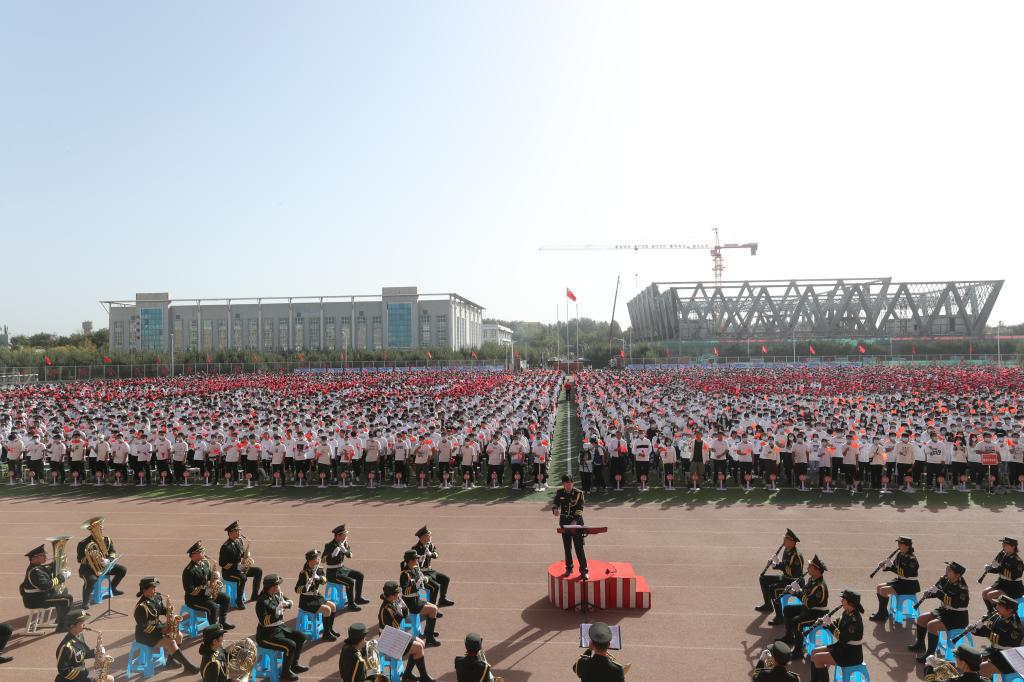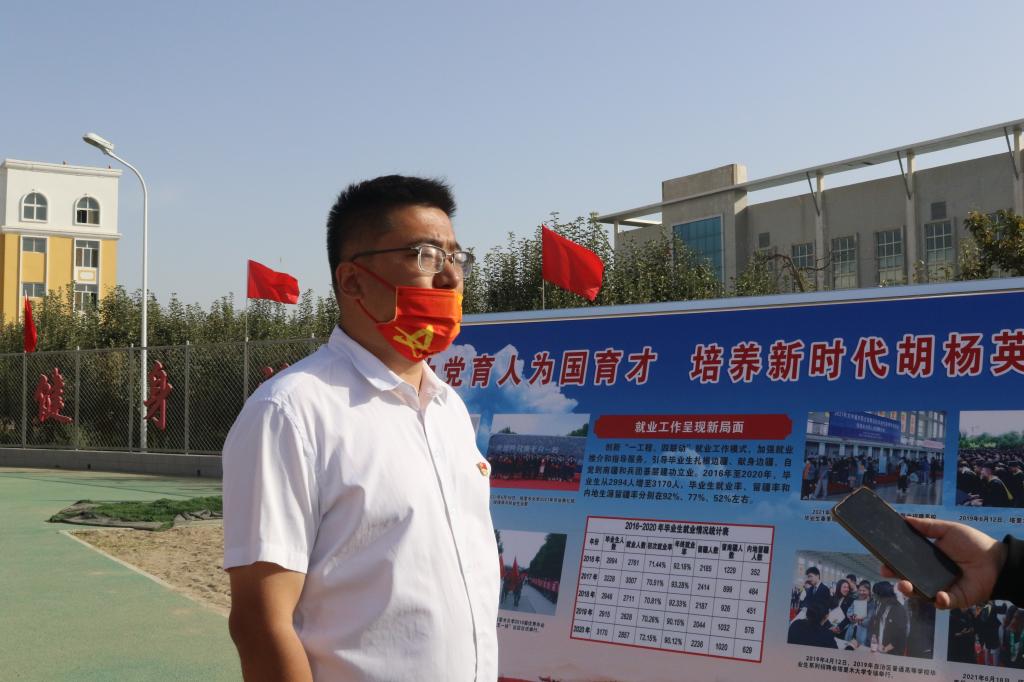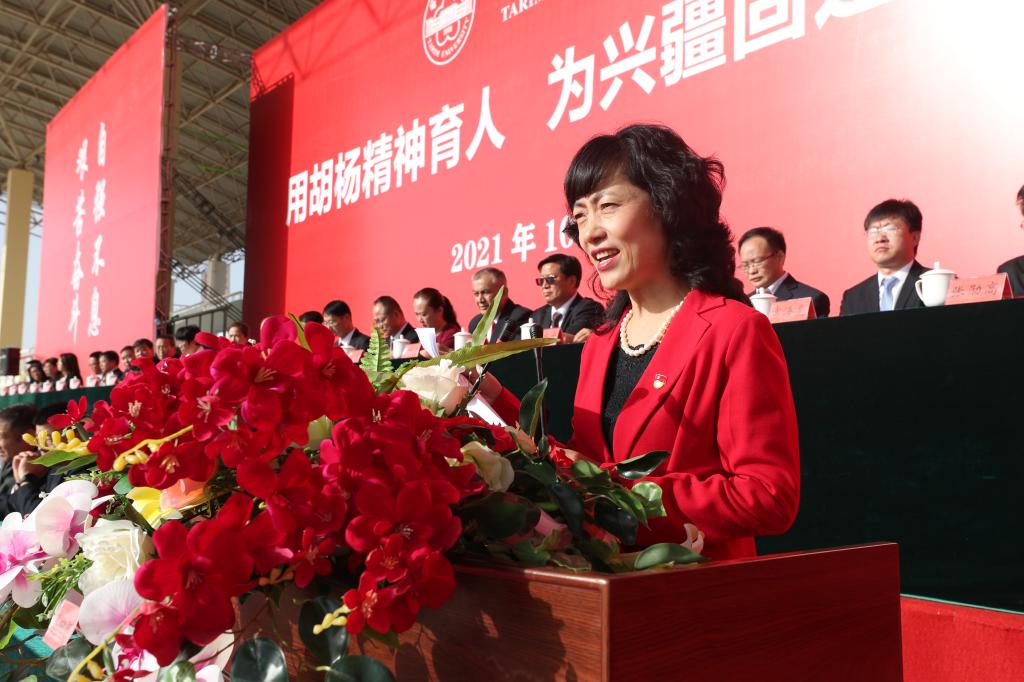 “用胡杨精神育人,为兴疆固边服务”……10月1日一大早,西区运动场上人头涌动,师生们个个满脸喜庆,一条条横幅标语清晰醒目,一张张宣传展板耀眼夺目,塔大满园处处洋溢着喜庆热烈的节日气氛。