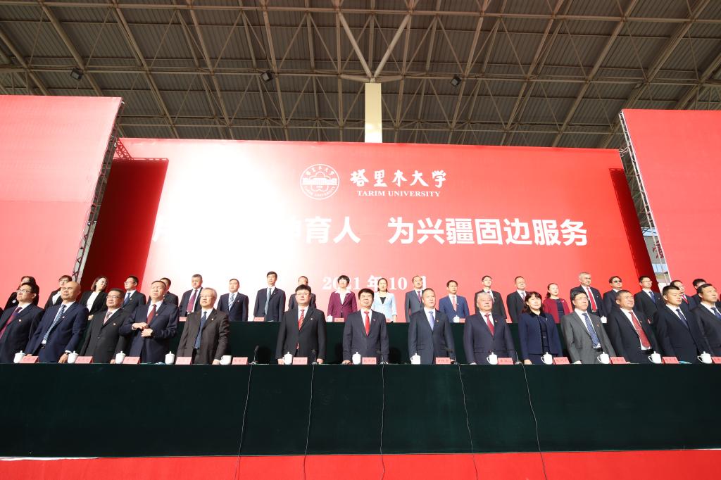 “起来,不愿做奴隶的人们,把我们的血肉,筑成我们新的长城……”上午10时30分,随着雄壮的《义勇军进行曲》,塔里木大学庆祝中华人民共和国成立72周年升国旗仪式举行。塔里木大学党委书记赵光辉,一师阿拉尔市党委书记、政委卢跃东,塔里木大学党委副书记、校长张传辉,党委副书记、纪委书记单洪山,党委副书记张爱萍,副校长张利莉,党委常委、副校长曲义勇、赵峰华、于军、石长青,同教育部银龄教师、学校处级干部、师生代表一起参加。