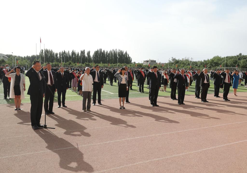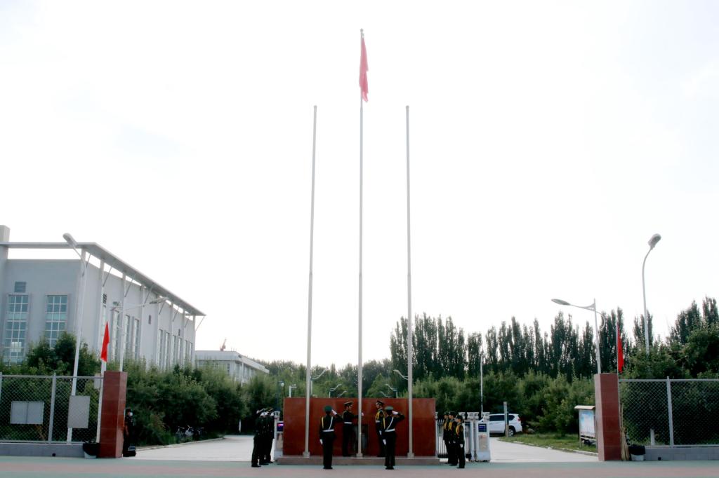 7月1日,学校在西区运动场隆重举行庆祝中国共产党成立99周年大会。上午10点,英姿飒爽的国旗护卫队成员迈着整齐的步伐,护送着鲜艳的五星红旗走向升旗台,展旗手将五星红旗抛向天空,全体观礼人员向国旗行注目礼,在振奋人心的国歌声中,五星红旗冉冉升起,迎风飘扬。