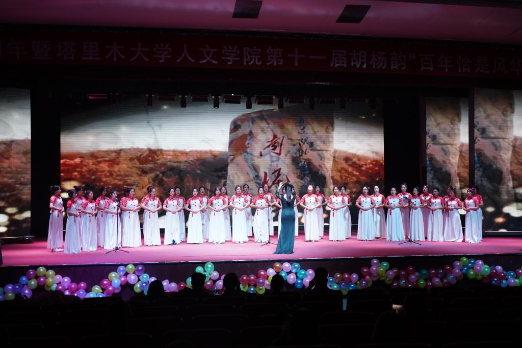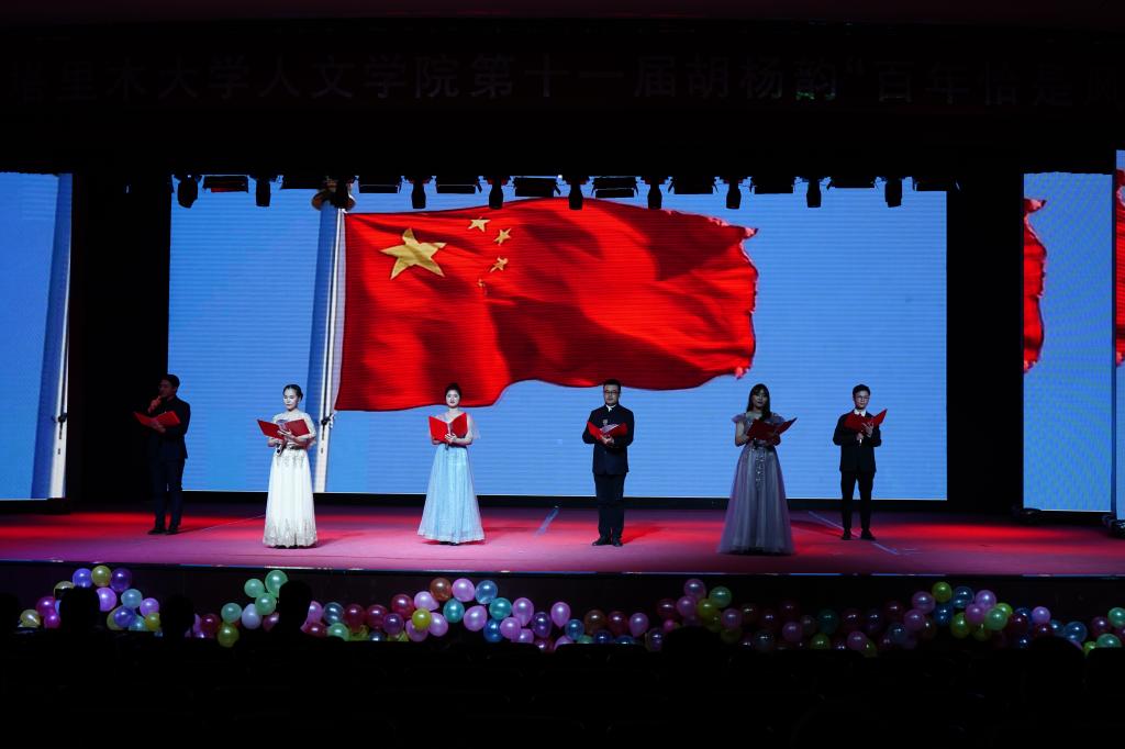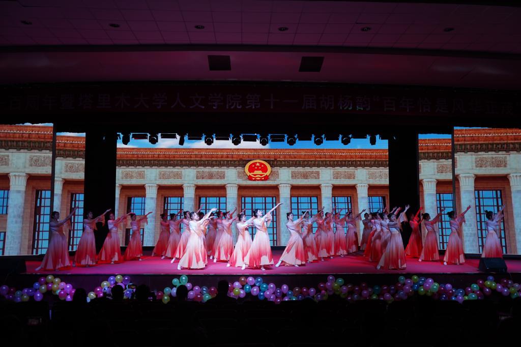 此次胡杨韵晚会以“百年恰是风华正茂”为主题,通过15个高质量的节目,共计200名师生参与表演,生动形象讲述了中国故事,饱含深情讴歌了伟大时代,展现人文师生的艺术素养、人文情怀。在欢歌笑语中为全院师生献上了一场精彩难忘的盛世文艺大餐。胡杨韵主题晚会自1999年举办首届以来,已成为学院赓续红色血脉,传承胡杨精神的特色文化品牌,记录了学院发展的“音”“画”,记录了人文学子的风采与成长。