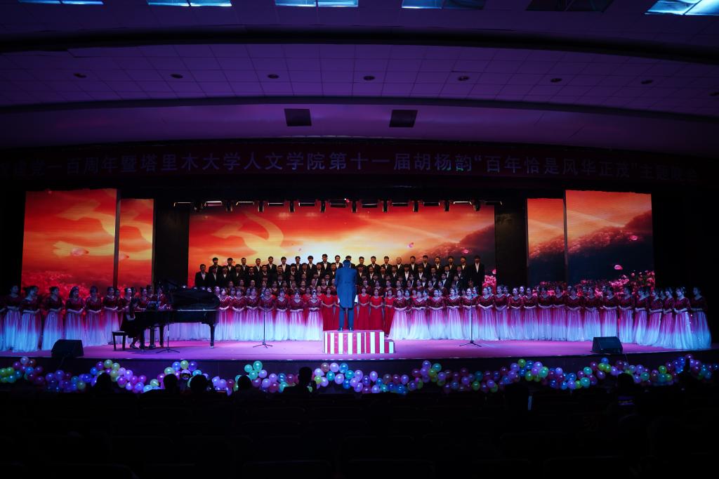 朗诵《百年恰是风华正茂》,讴歌伟大时代。小合唱、大合唱分篇章演出,用歌曲记录人民的伟大实践,用音乐谱写中国故事。女生小合唱《南泥湾》、男生小合唱《打靶归来》、大合唱《没有共产党就没有新中国》,将本台晚会推向了高潮。最后,晚会在全体同学齐声高唱《光荣塔大》中落下帷幕。