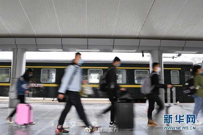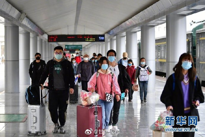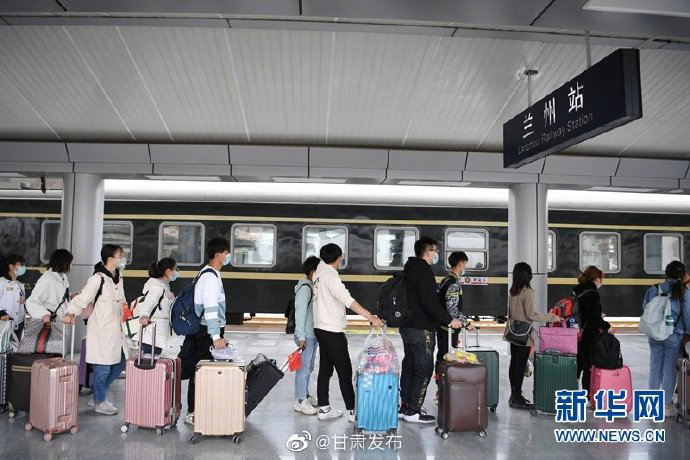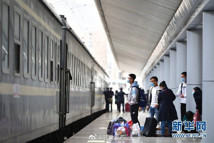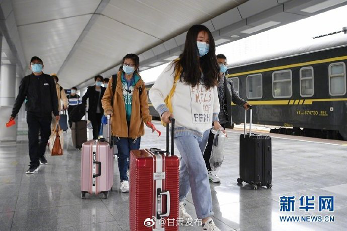 抓好防控复工复产【甘肃开行多趟“点对点”专列助力学生返校复学】4月17日,塔里木大学的学生准备从兰州火车站登上学生专列出发。当日,中国铁路兰州局集团有限公司又一趟“点对点”学生专列K4097次列车开行,运送兰州、武威、张掖、酒泉等地的学生前往新疆阿克苏返校复学。(新华社记者 陈斌 摄)