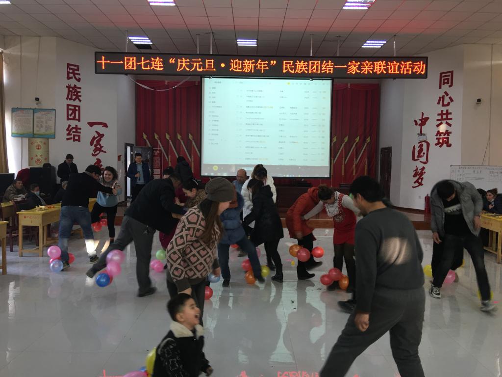 活动伊始,工作队队长陈甲武为大家送上新年的祝福。接着,大家齐唱《没有共产党就没有新中国》、《歌唱祖国》等爱国主义歌曲,趣味游戏《踩气球》紧张激烈,全员跳起《麦西来甫》歌舞飞扬,职工文化大礼堂一派欢乐景象。大家围坐着在一起话团结、叙友情、聊生活、拉家常,其乐融融,共庆元旦佳节的到来。