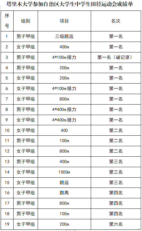 21日,在首个比赛日上,塔大健儿奋力拼搏、驰骋赛场,用青春的热血彰显胡杨精神,用矫健的身姿再现塔大风采。喜获6个项目的8个名次,其中,女子400米包揽冠亚军、男子三级跳获冠军、男子100米获第2和第4名、男子400米获第3名,女子1500米获第3名、女子跳高获第4名,为运动员接下来比赛奠定了坚实基础,提振了继续拼搏的信心。第二比赛日,塔大运动健儿不负众望,努力拼搏,一举拿下男子200米、女子200米、男子4*100米、女子4*100米4个冠军和女子跳远第3名、女子200m第6名的优秀成绩。其中,男子4*100米破大会记录。比赛最后一日,塔大健儿炙热的青春继续点燃,夺得了女子800米冠亚军、男子4*400米、女子4*400米冠军,男子800米第4名。三天的比赛,塔里木大学代表队共获得9个项目第一名,3个项目第二名,3个项目第三名,3个项目第四名,1个项目第六名的好成绩。同时,塔里木大学获得大学甲组团体总分第二名,王军、帅伟获优秀教练员,孟迪获优秀裁判员,唐斌、陈曼瑜获优秀运动员称号。