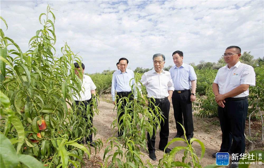 7月21日至24日,中共中央政治局常委、全国政协主席汪洋在新疆调研兵团工作。这是23日,汪洋在兵团十师北屯市千亩桃园了解果树长势。新华社记者 李涛 摄
